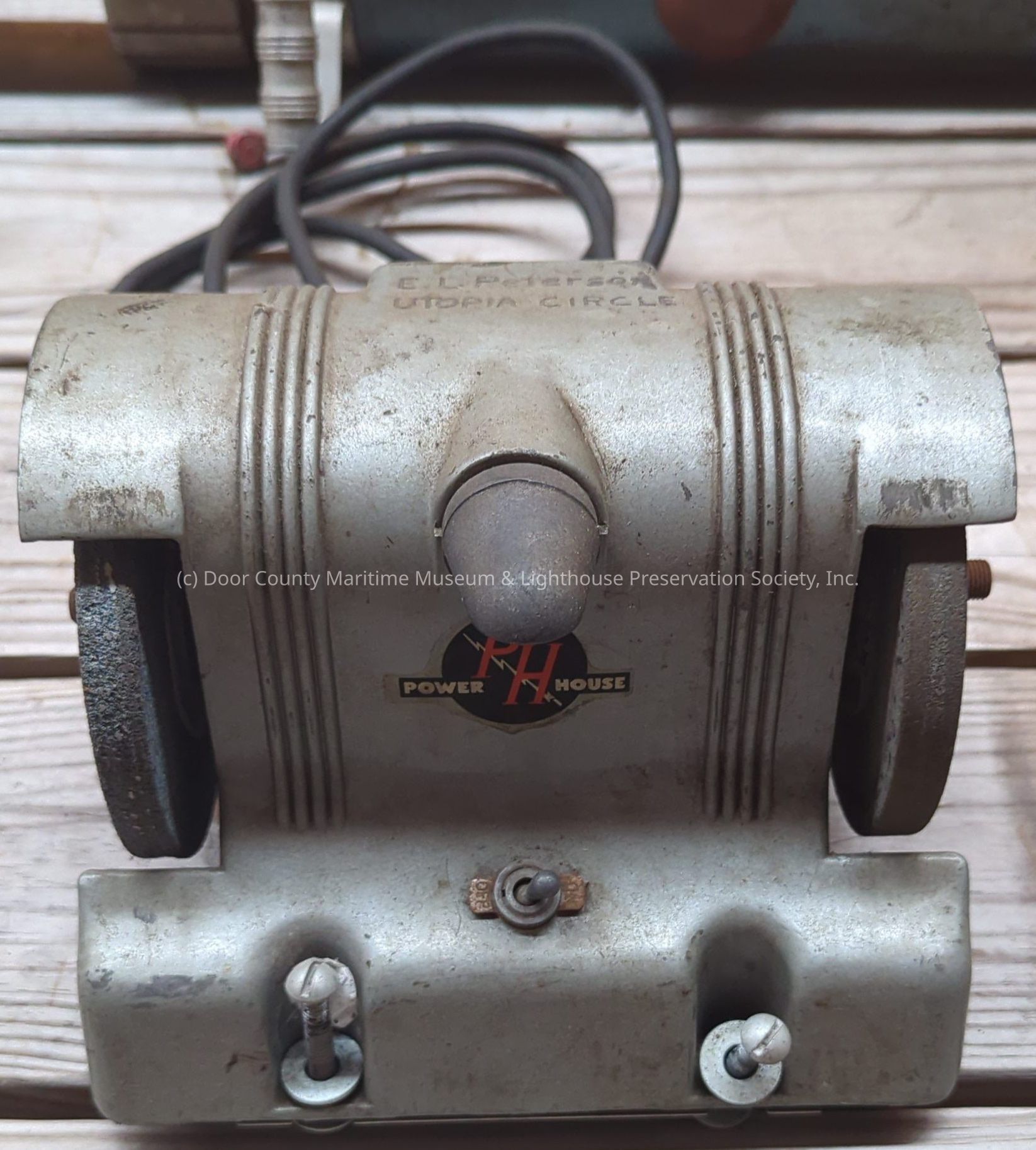 Silver and grey metal tool grinder. Powerhouse emblem on the front