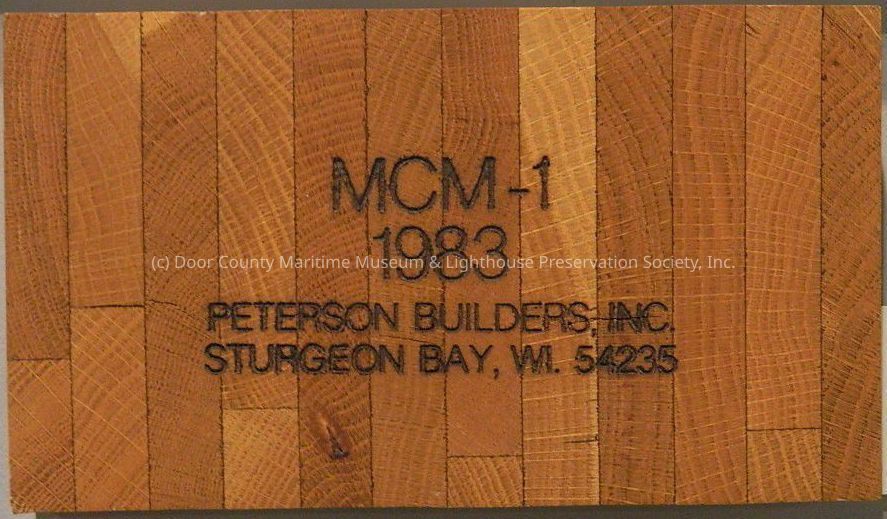 Varnished wood plaque: black writing; "MCM-1 1983, Peterson Builders, Inc., Sturgeon Bay, WI 54235."Location