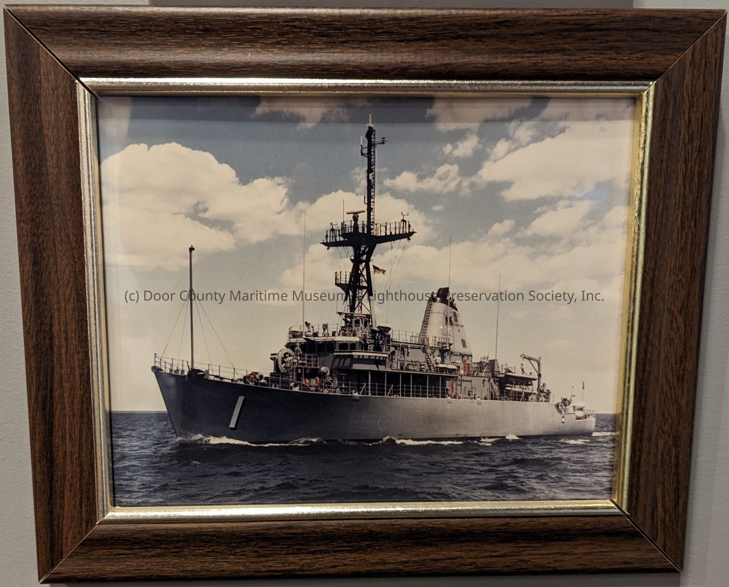 Color photograph of vessel MCM 1 underway; brown wood frame; gold trim; glass; metal hanger on back.Location