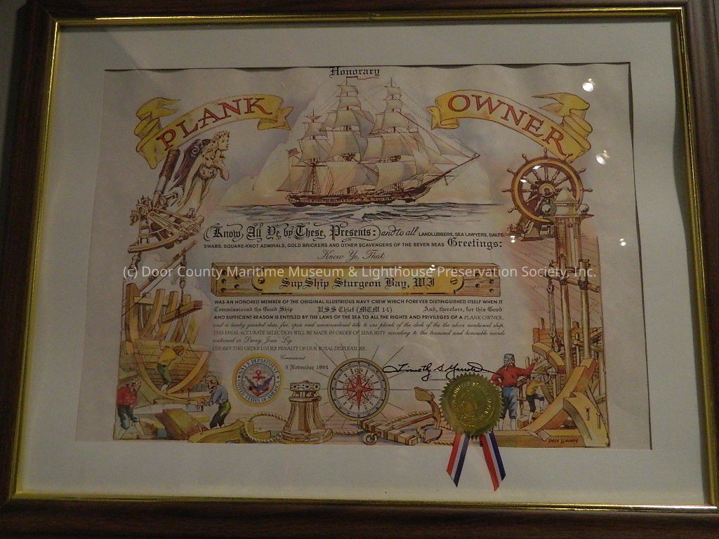Whimsical honorary plank owner certificate for SupShip, Sturgeon Bay for USS "Chief" (MCM-14).
