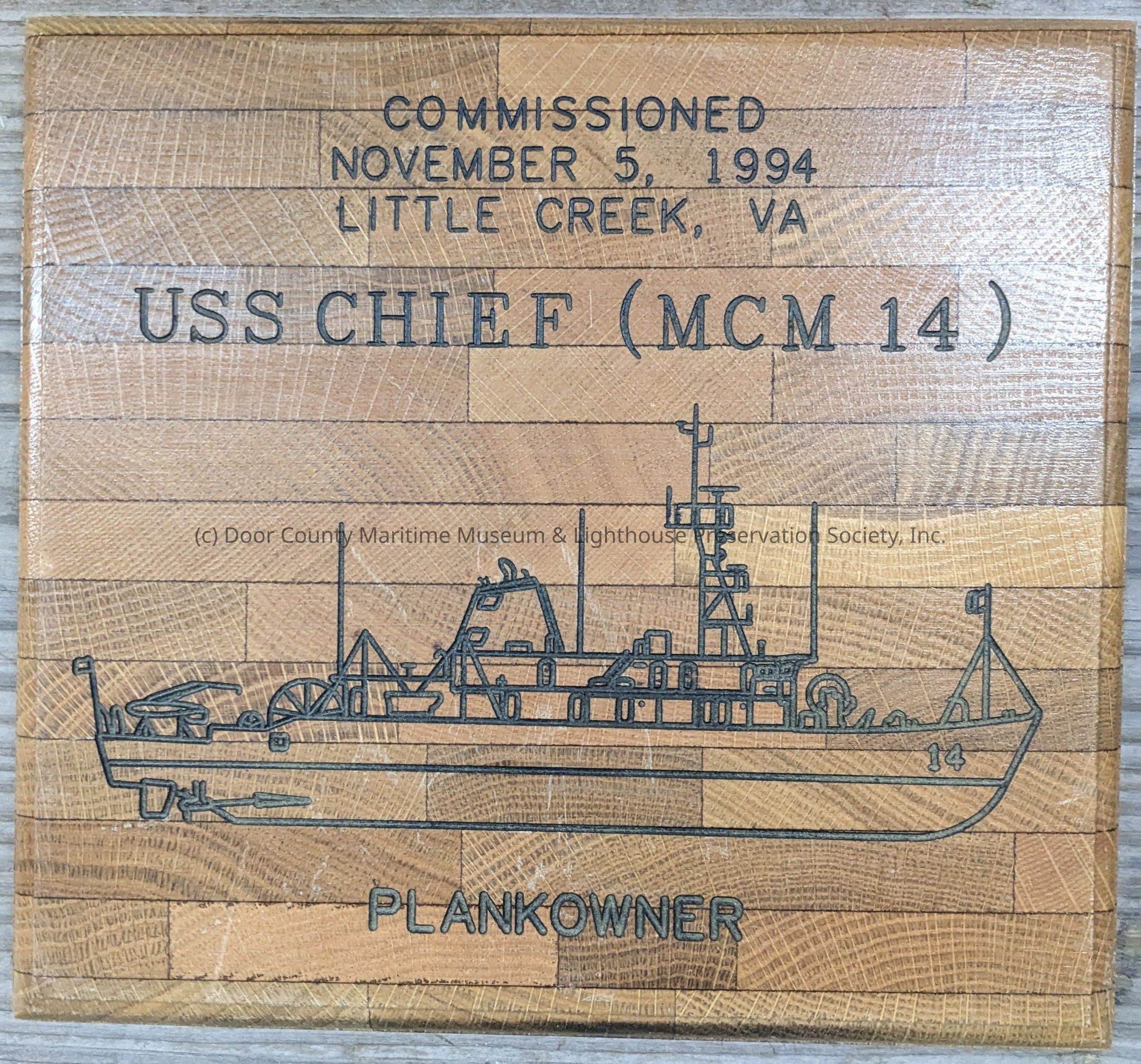 Wooden plaque with etching of the vessel MCM-14 USS Chief