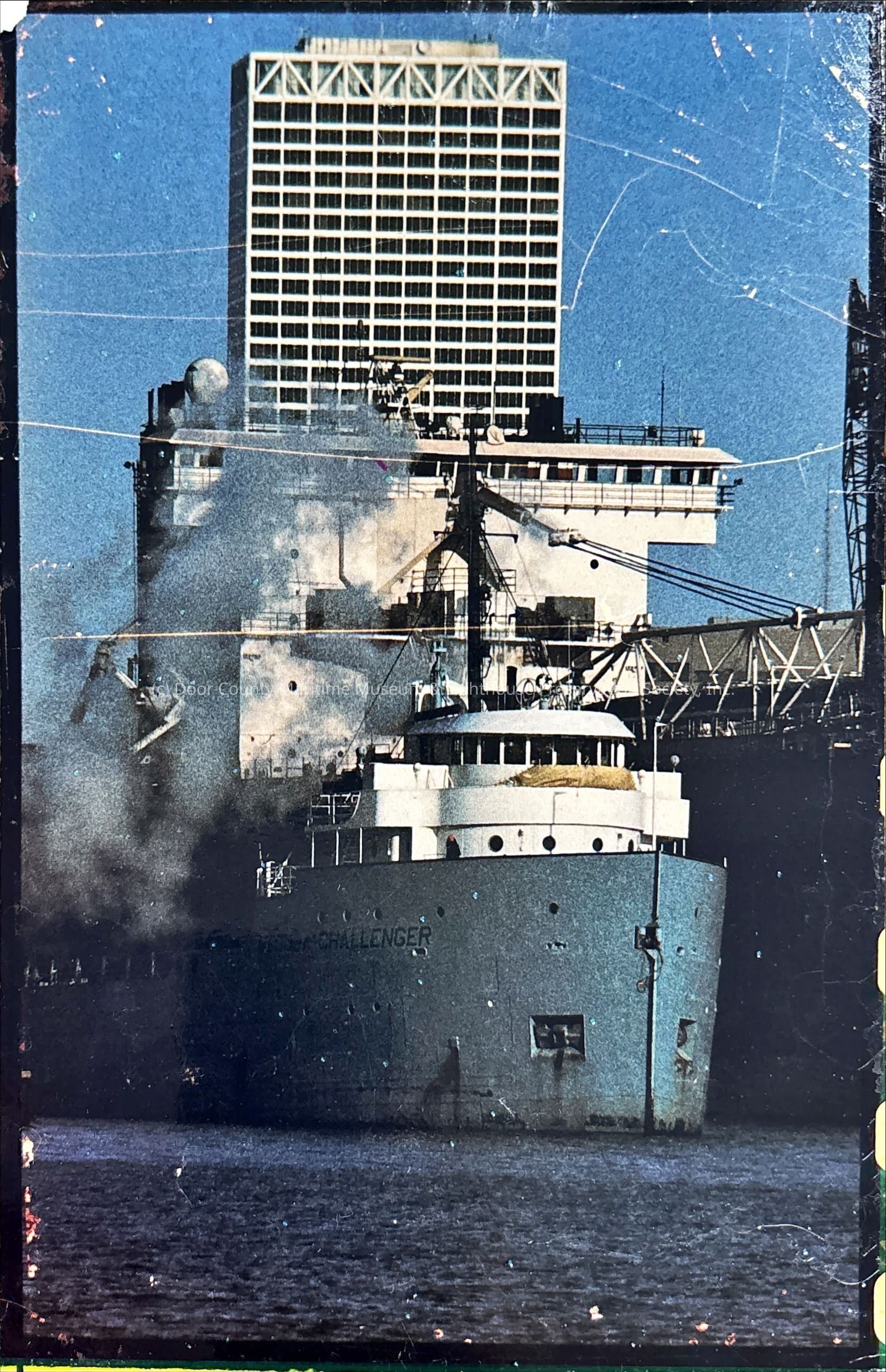 Bow of ship Medusa Challenger next to much larger vessel (name unknown) in front of a tall rectangular building against a blue sky. Steam/Smoke in the air behind Challenger's Pilot House. Several horizontal scratches on photo side along with wear to edges and corners, pinprick bubbles throughout print.