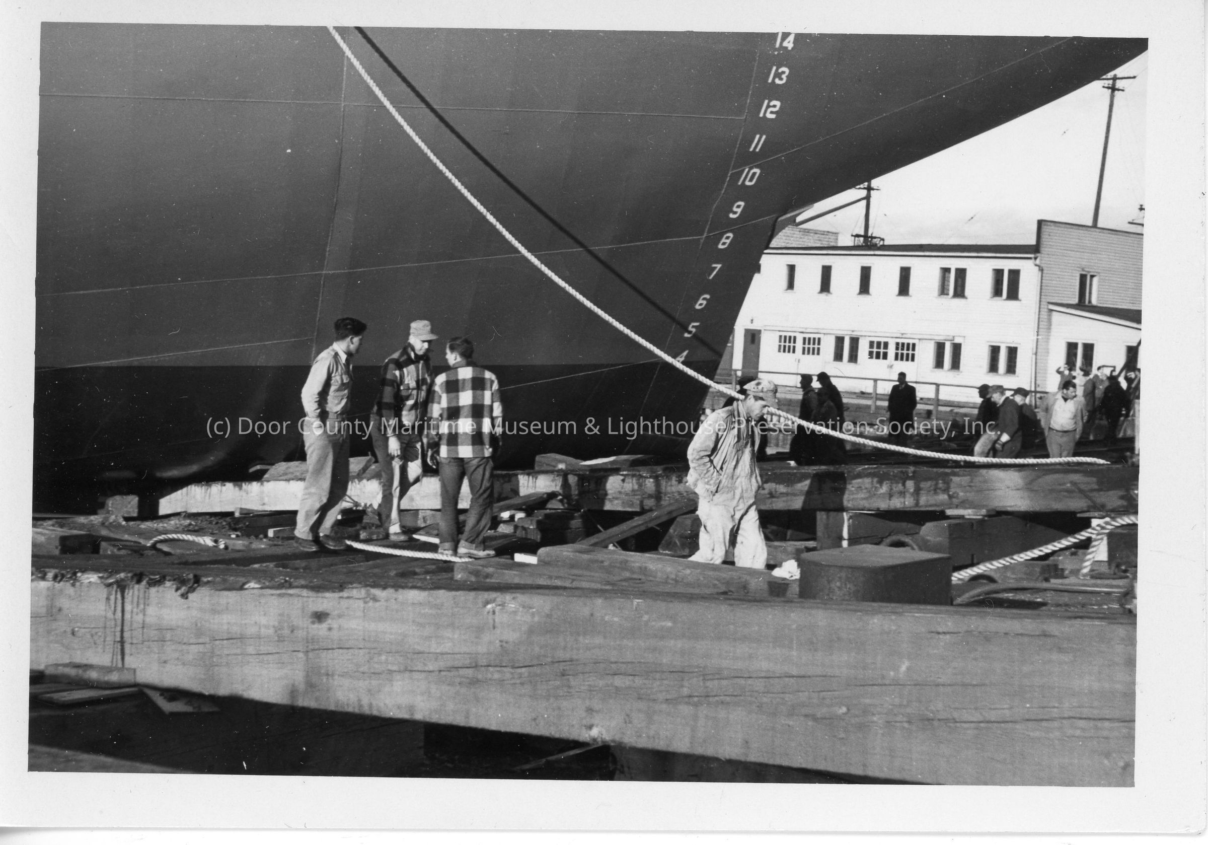 Colorless photograph. Depicts men near stern of cargo vessel with buildings in backgroundLocation