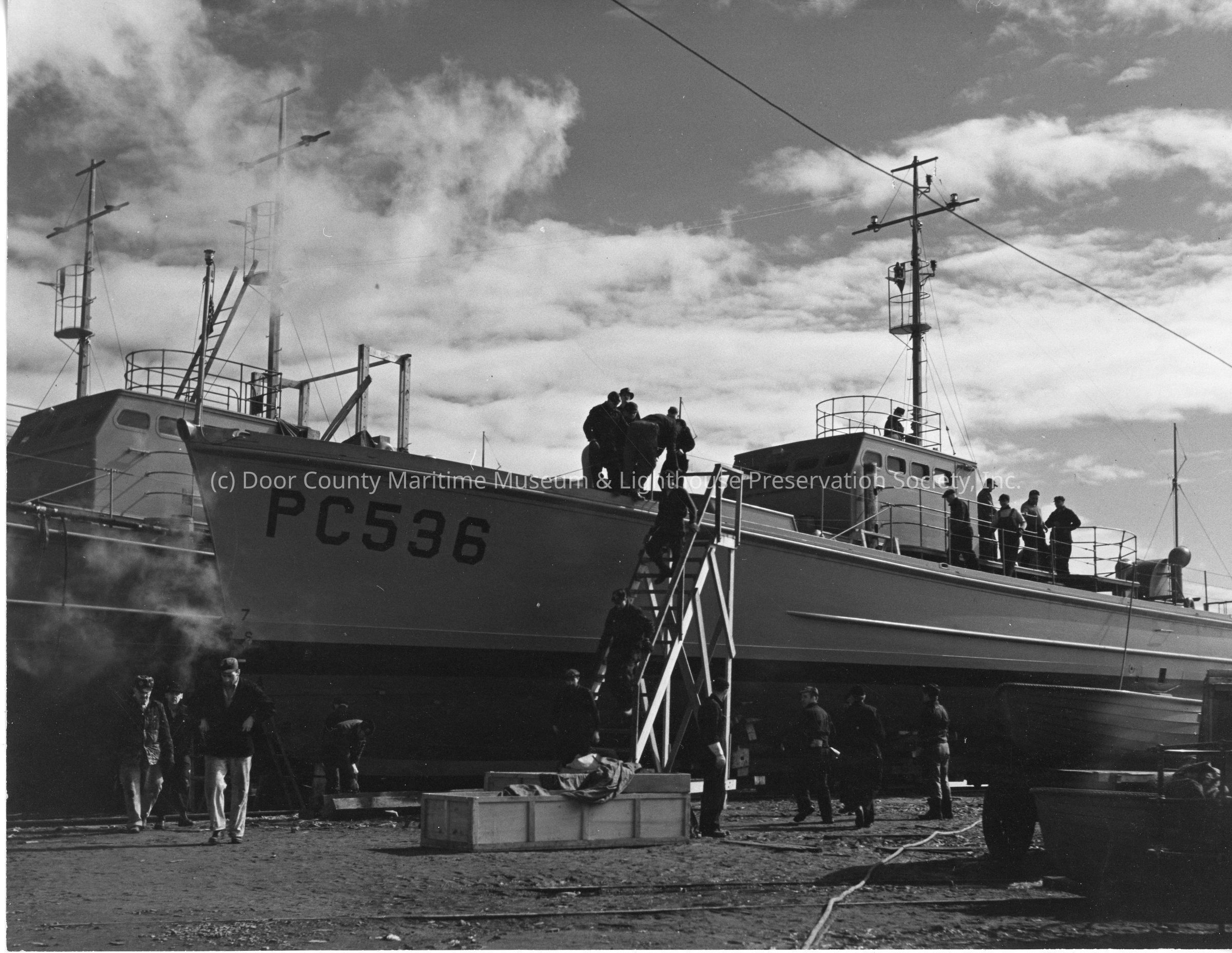 Men on deck of PC-536 while docked at Peterson Boat Works