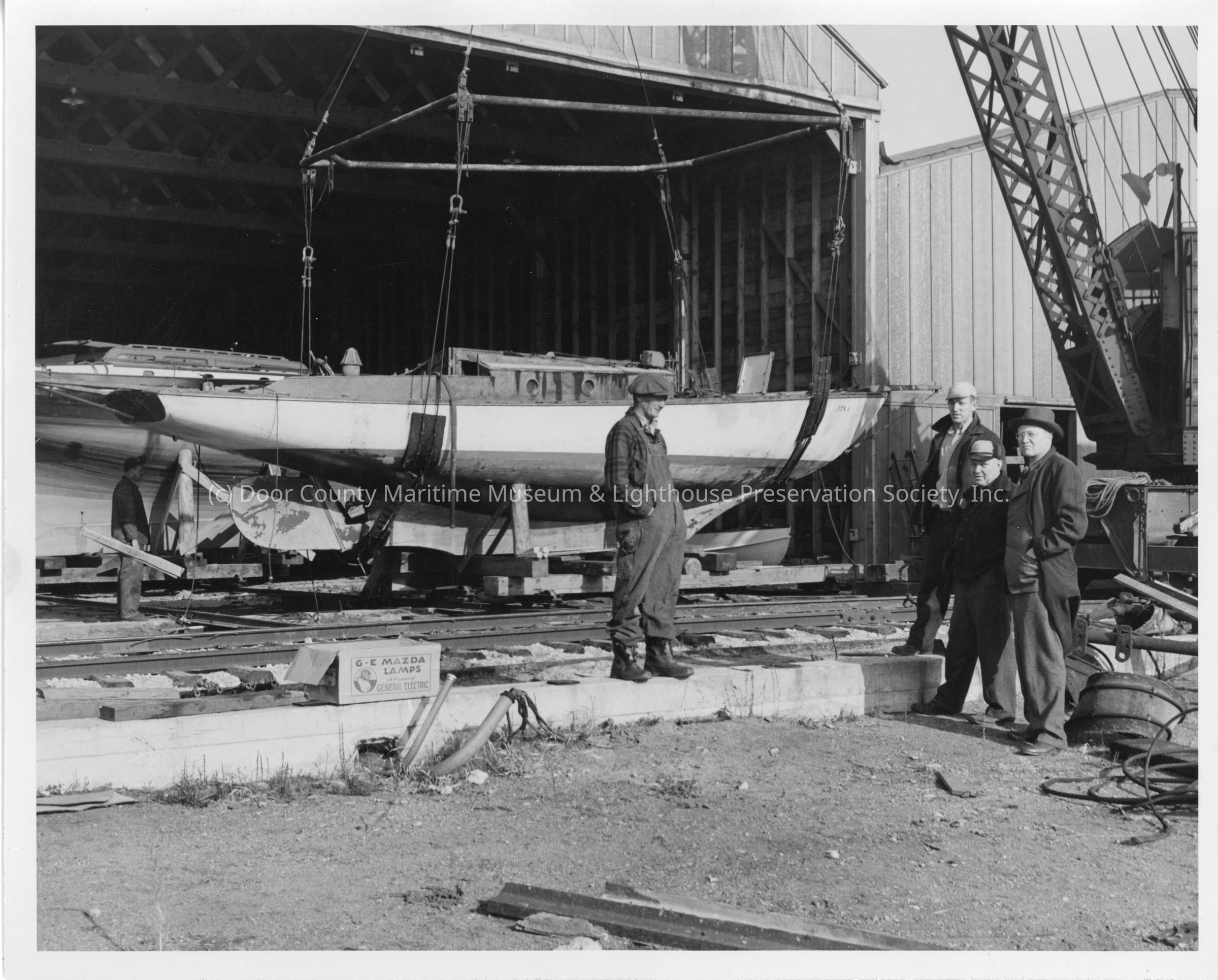 Men standing next to suspended sailboat Halfmoon