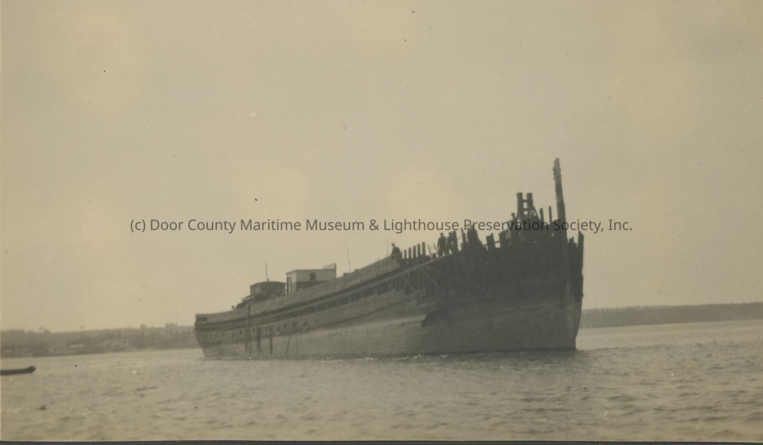 Men standing on floating unidentified hull of vessel.