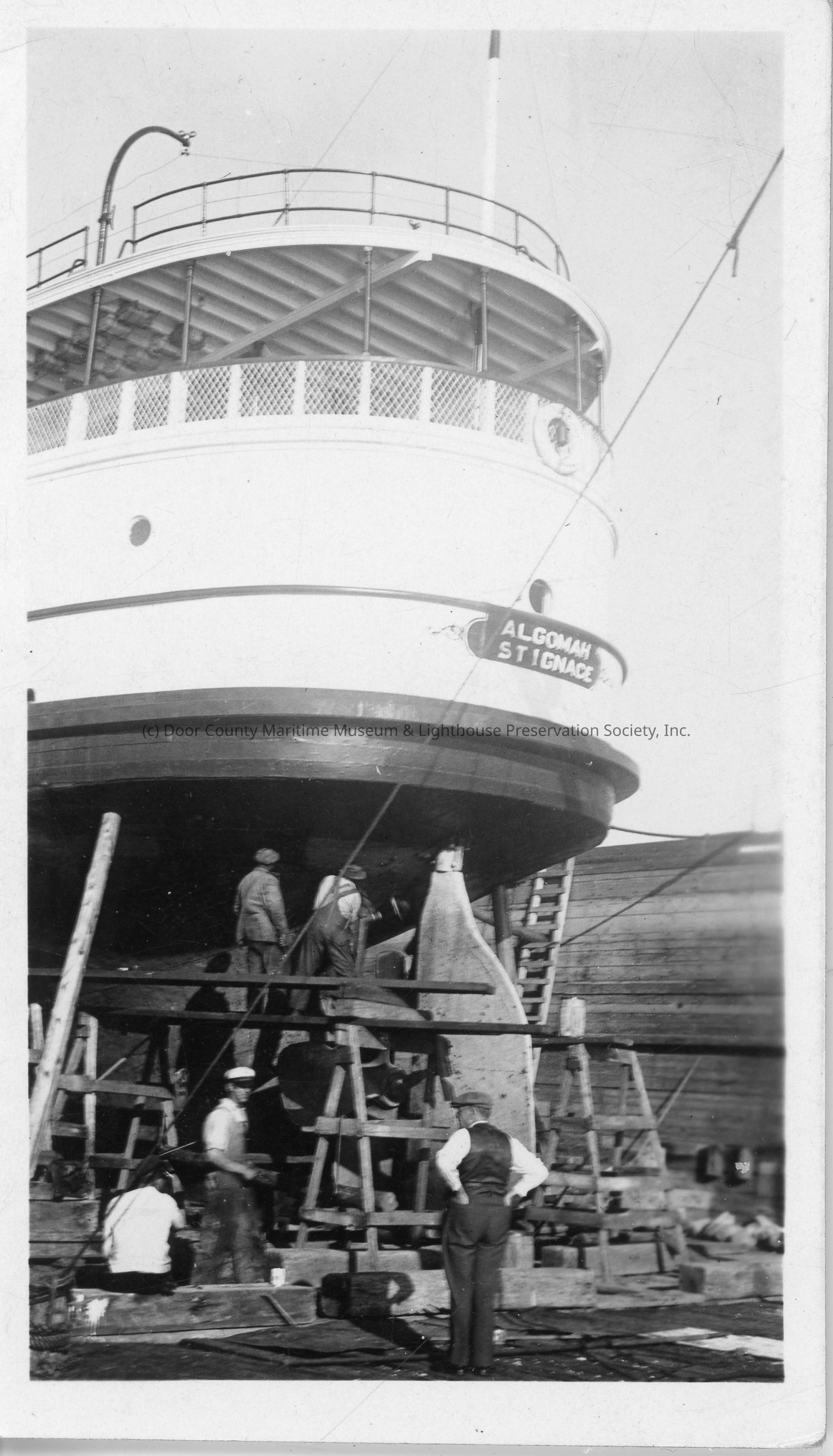Men working on rudder of Algomah in drydock of SBSB&DD Co.
