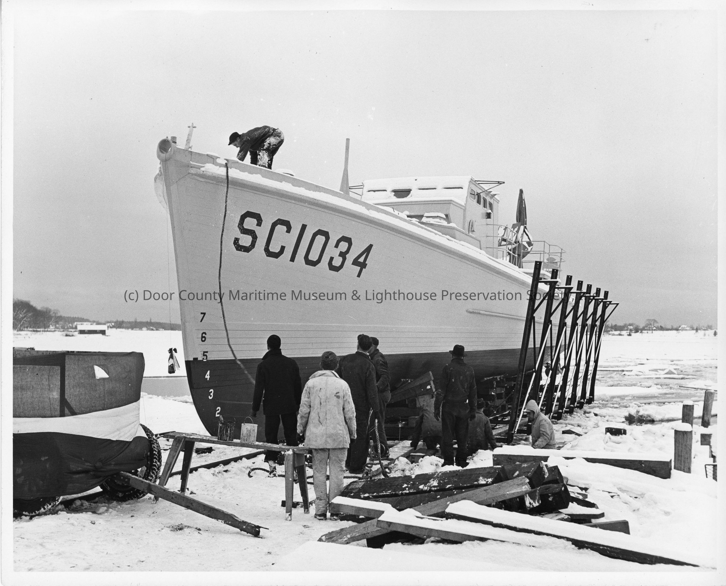 Men working on SC-1034 in cribbing pre-christening at Peterson Boat Works