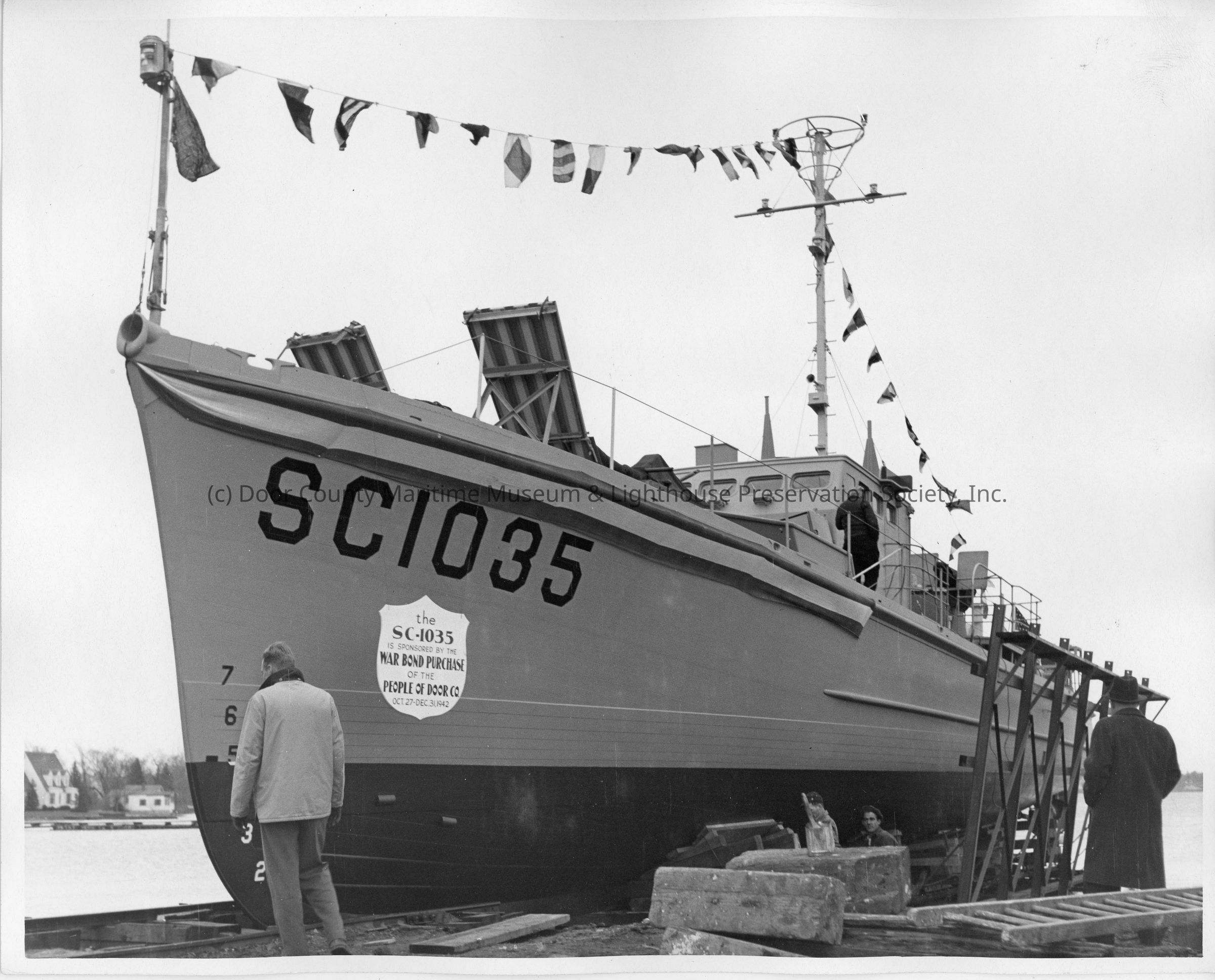 Men working on SC-1035 pre-launch at Peterson Boat Works April 12, 1943