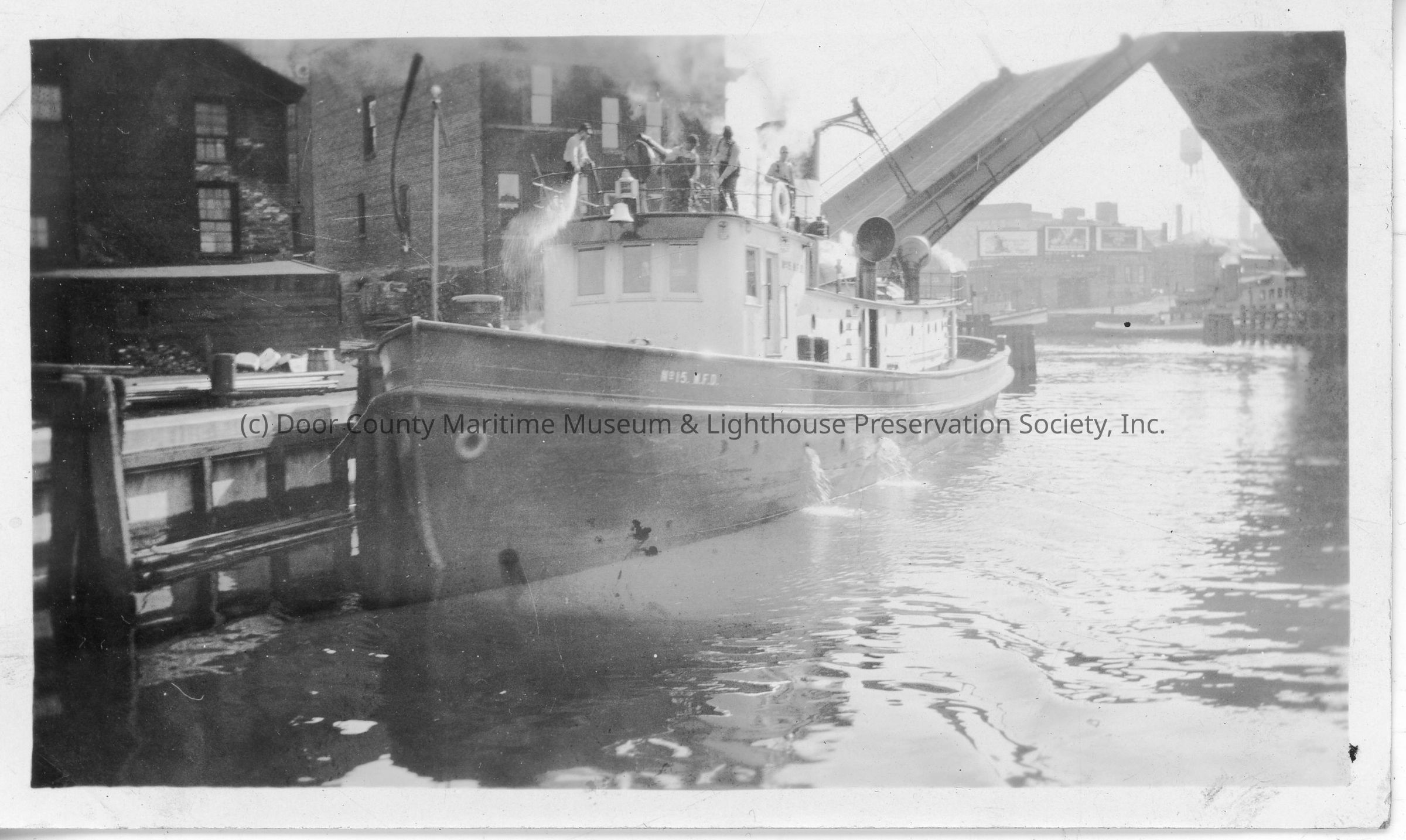Men working on tugboat docked in river