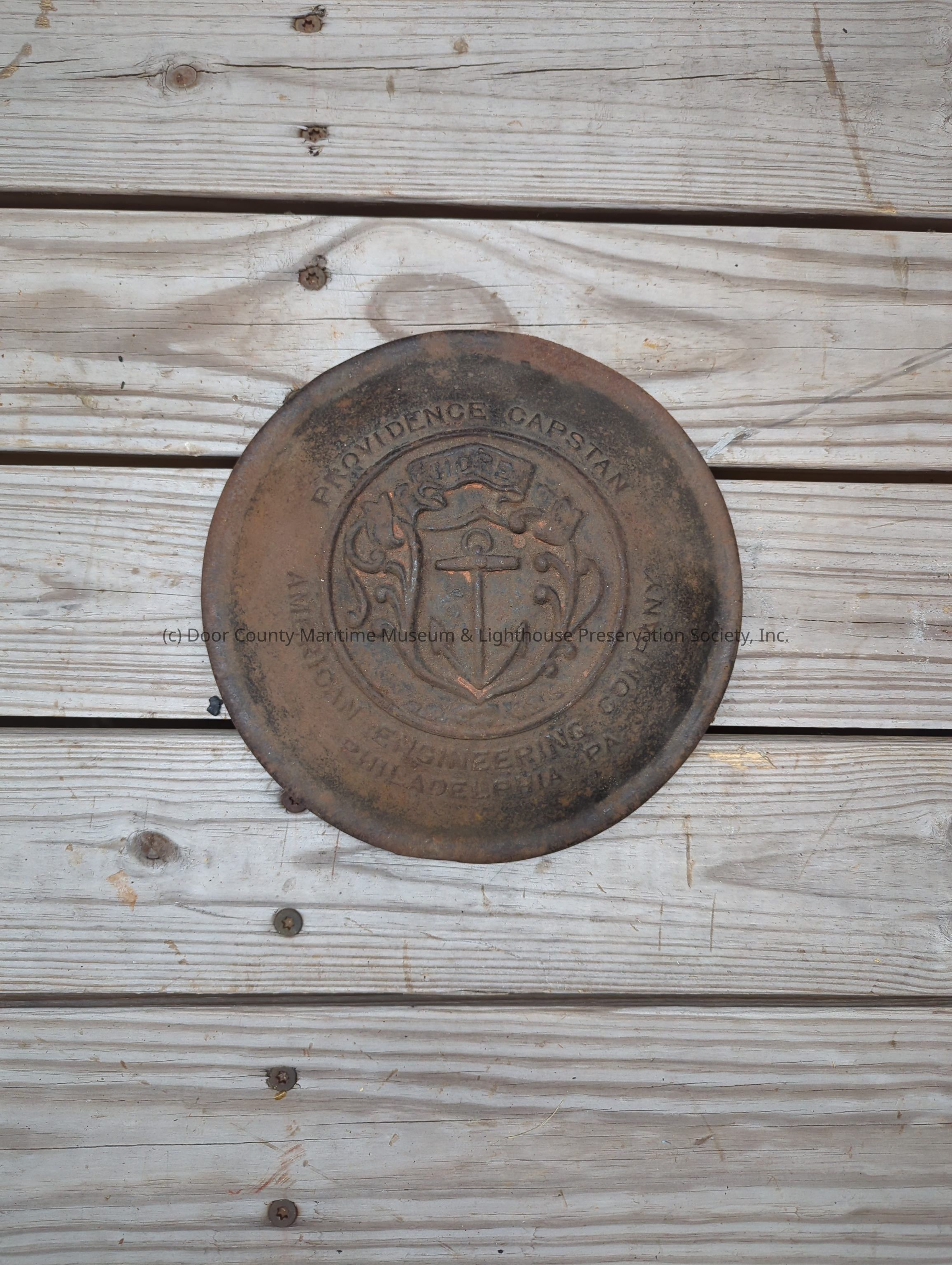 Brown and black metal capstan. Metal is corroded