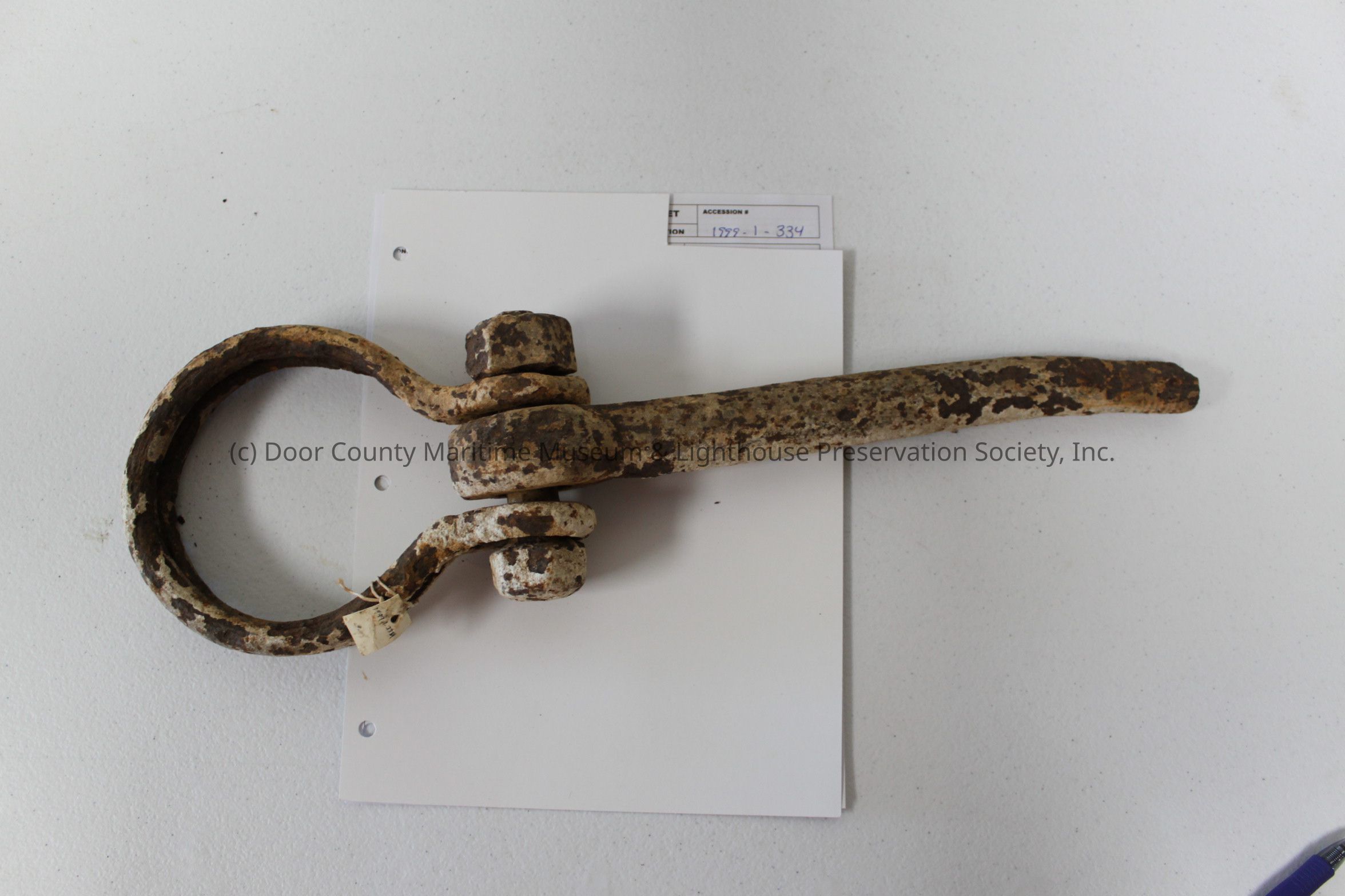 Rod with eye, bolted to circle ring. Rusty, broken on rod end. Used to hold down the deadeye blocks that ran rigging along the course of the ship.