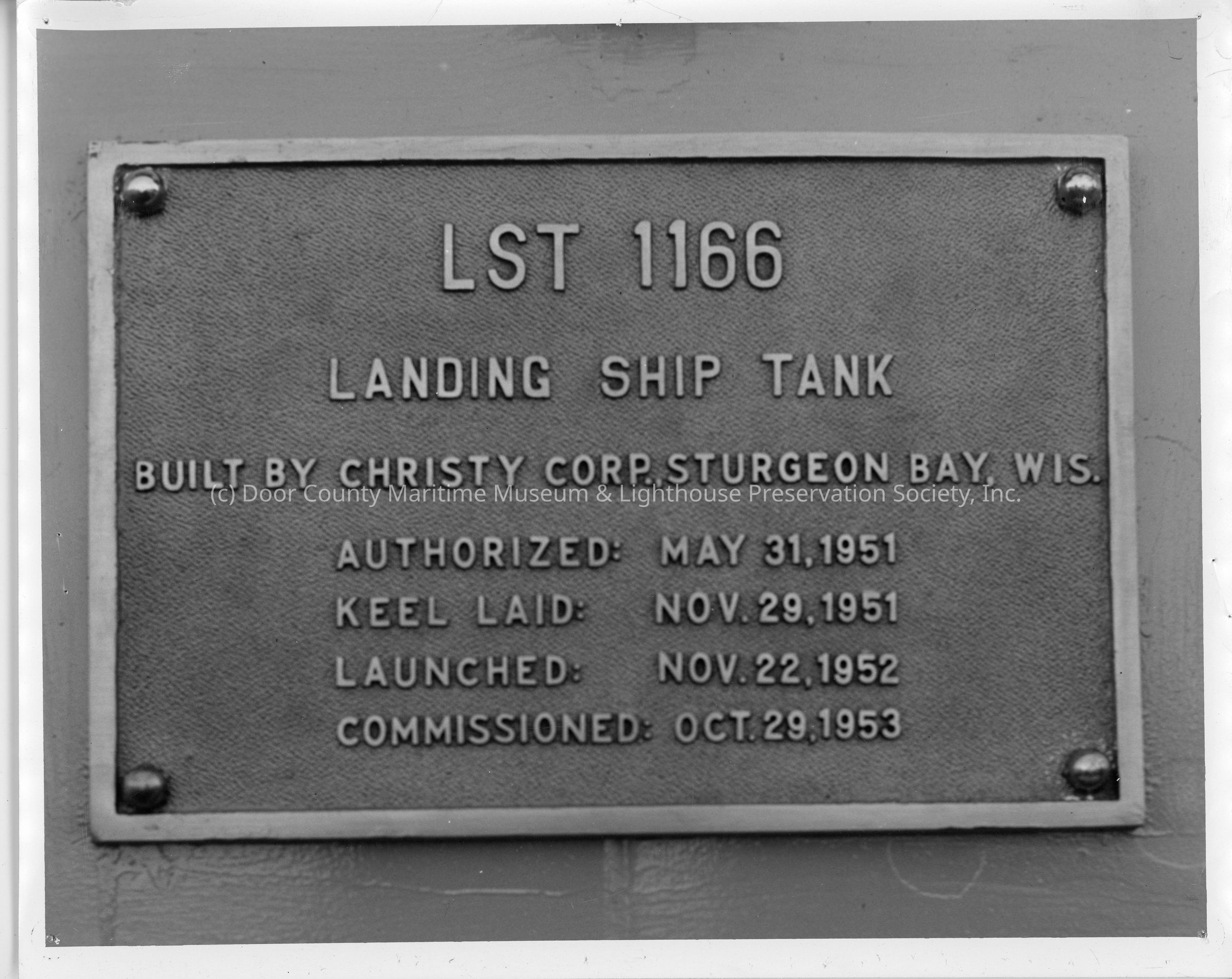 Metal plate with dates relating to LST-1166