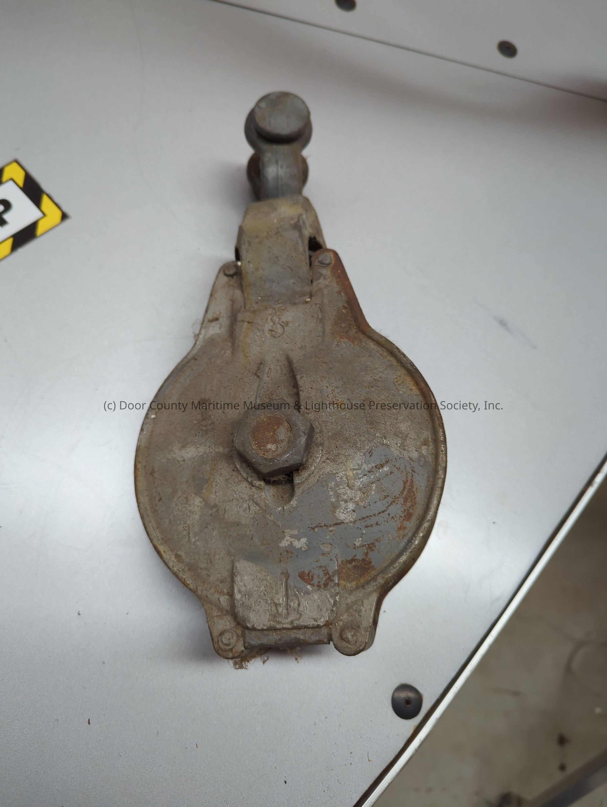 Metal pulley with no hooks. Rusted and scratched. "8" inscribed on object