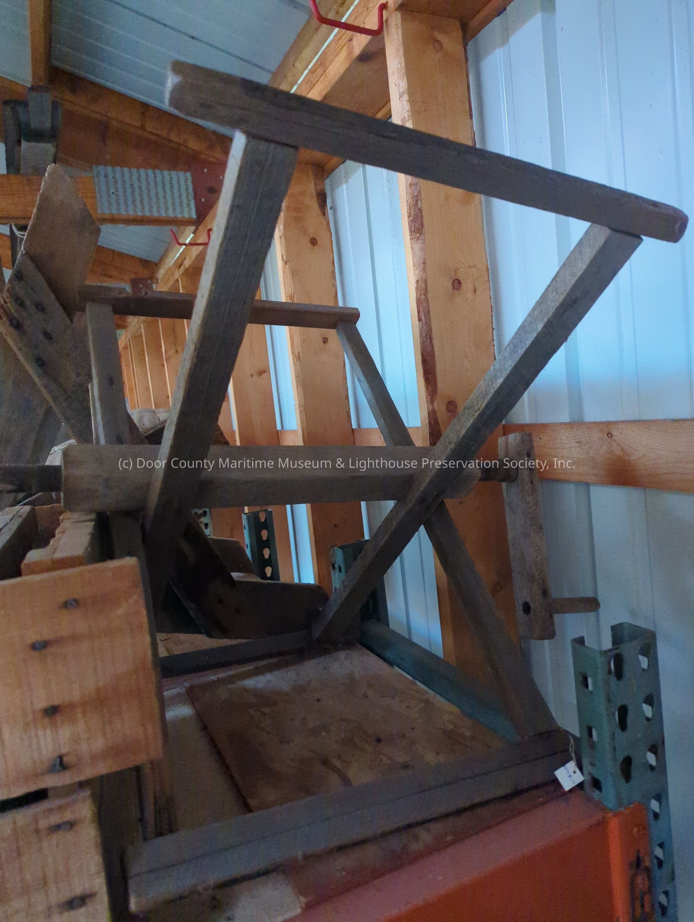 Some parts broken off of handle on one end. Triangular braces on each end. Weathered wood