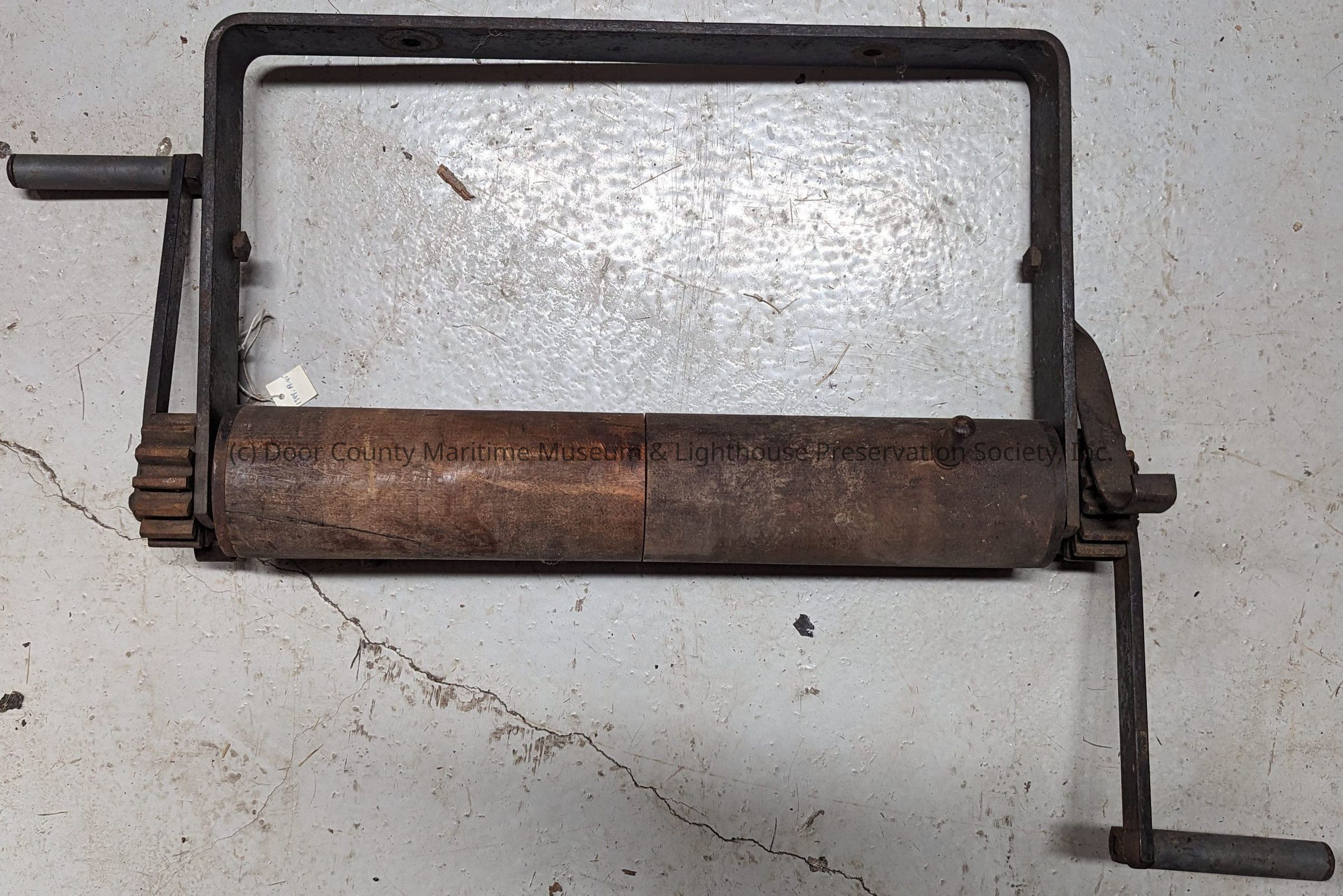 Black and dark brown. End gears are rusted. Pins on roller act as a guide. Some cracks are visible in wood roller