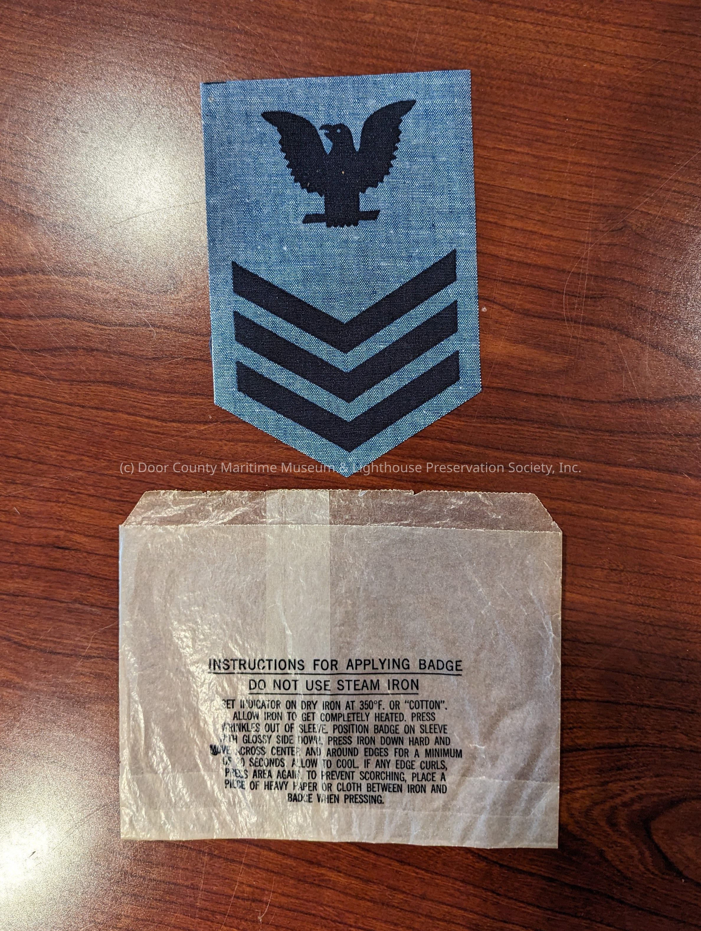 Blue military patch with a black eagle above three black chevrons