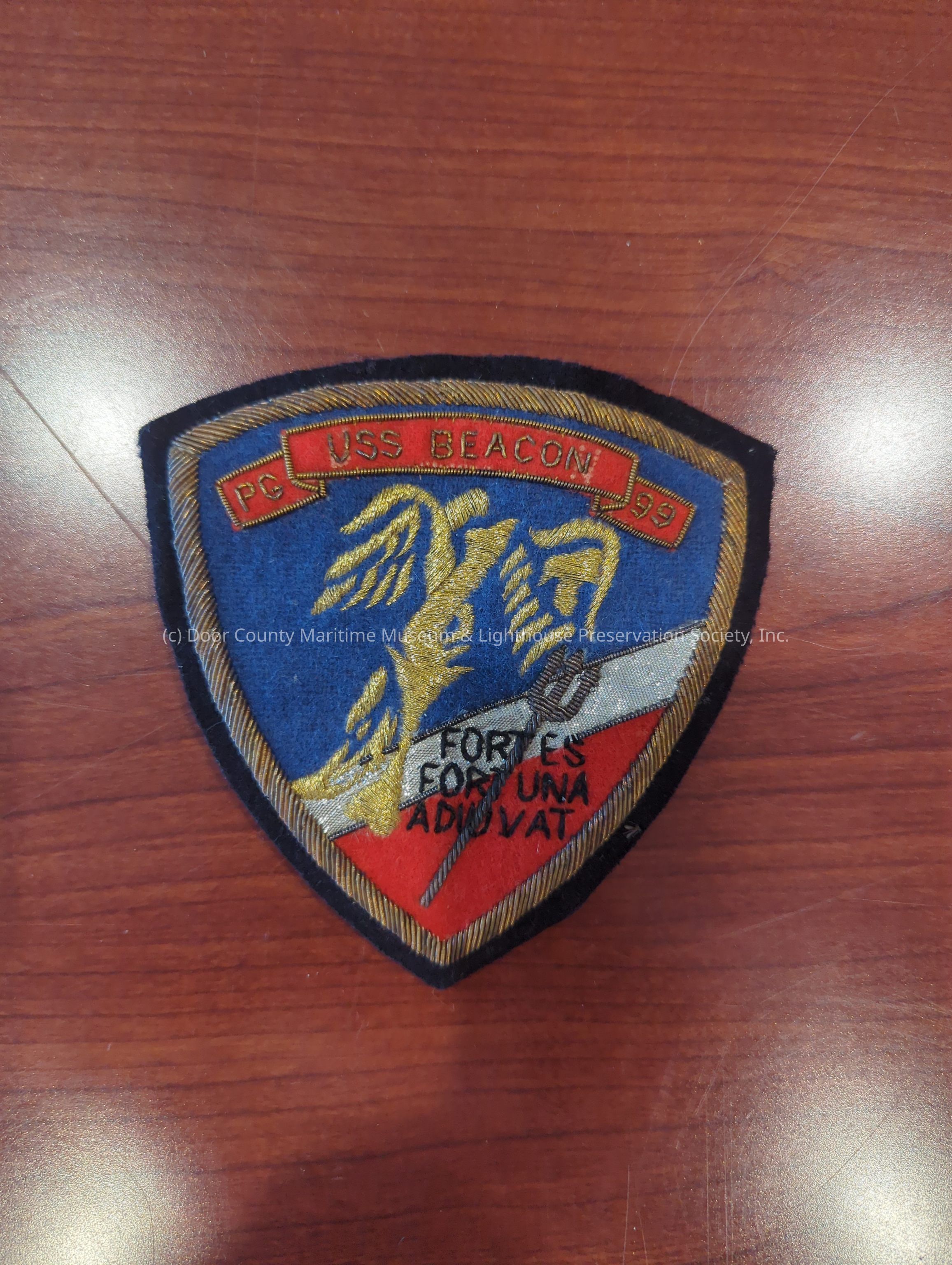 Patch, military: multi-color black, gold, red, blue, white; shield shape; PG USS BEACON 99; FORTES, FORTUNA, ADIGVAT; worn on work jacket - decorative, not uniform.Location