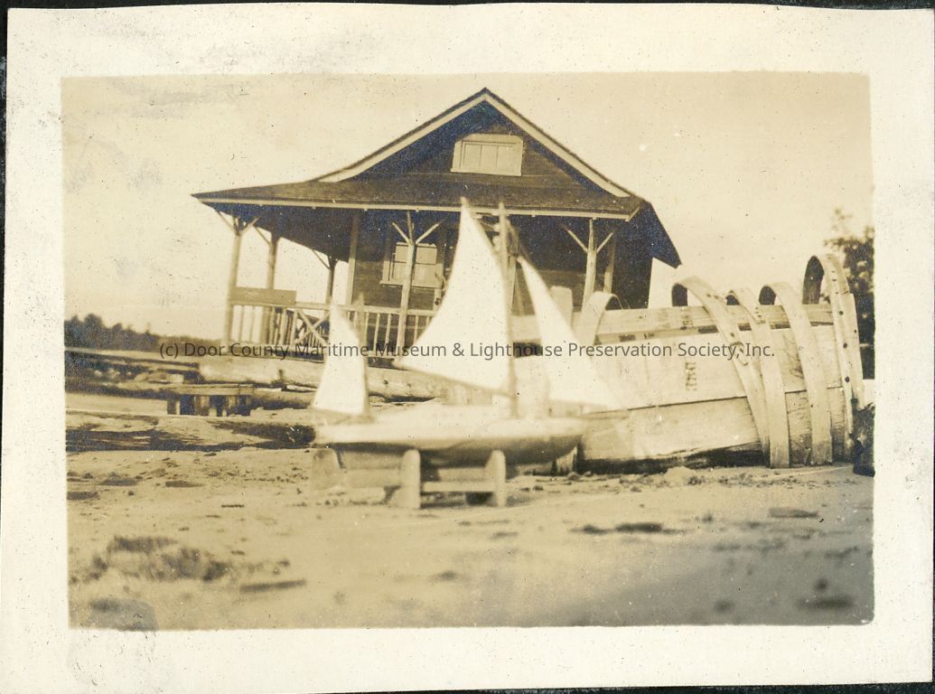Model sailboat in stand on shoreline, in front of wooden barrel that's fallen apart. Behind is a bathouse and pier. Boat is identified as Eric of Fish Creek.Location
