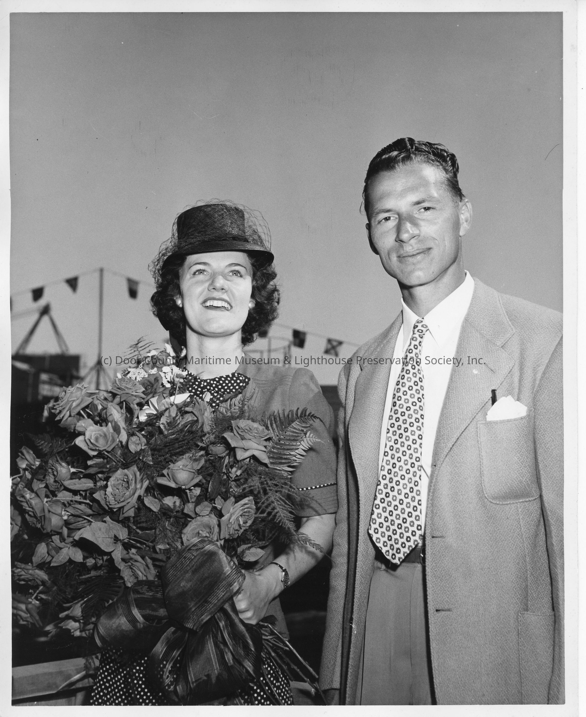Mrs. C. W. McKee holding roses alongside man at PC-1174 christeningEntry/Object ID