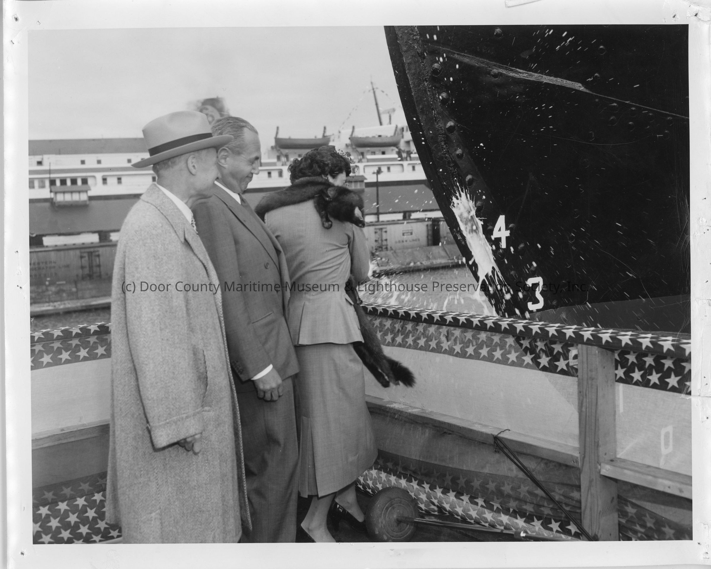 Walter Tuohy, Governor Walter Kohler, and Mrs. Charlotte Kohler. Mrs. Kohler christening the BadgerLocation