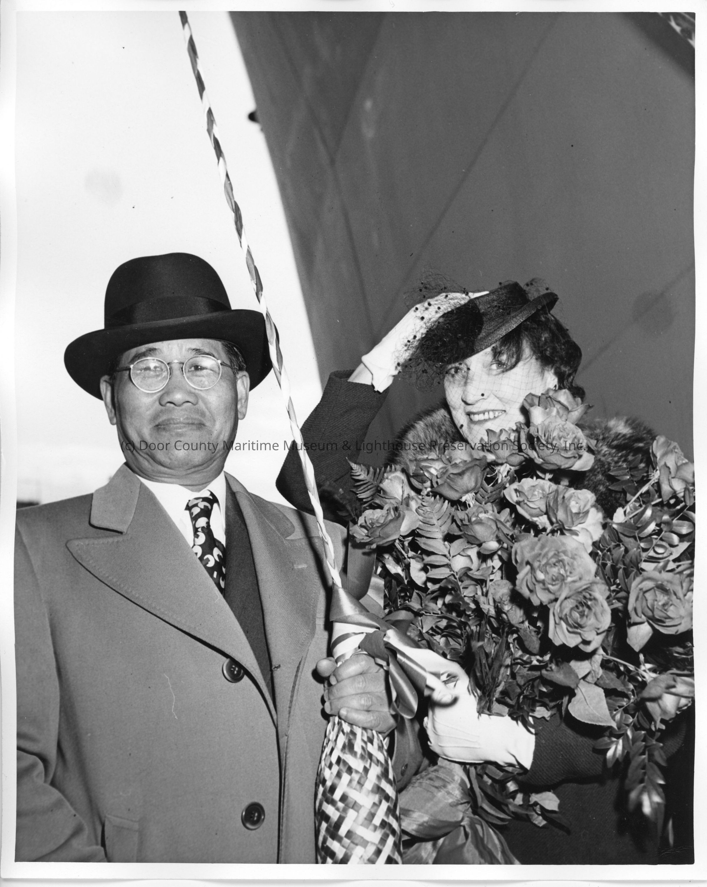 Mrs. Galliane holding flowers alongside man holding christening bottleEntry/Object ID