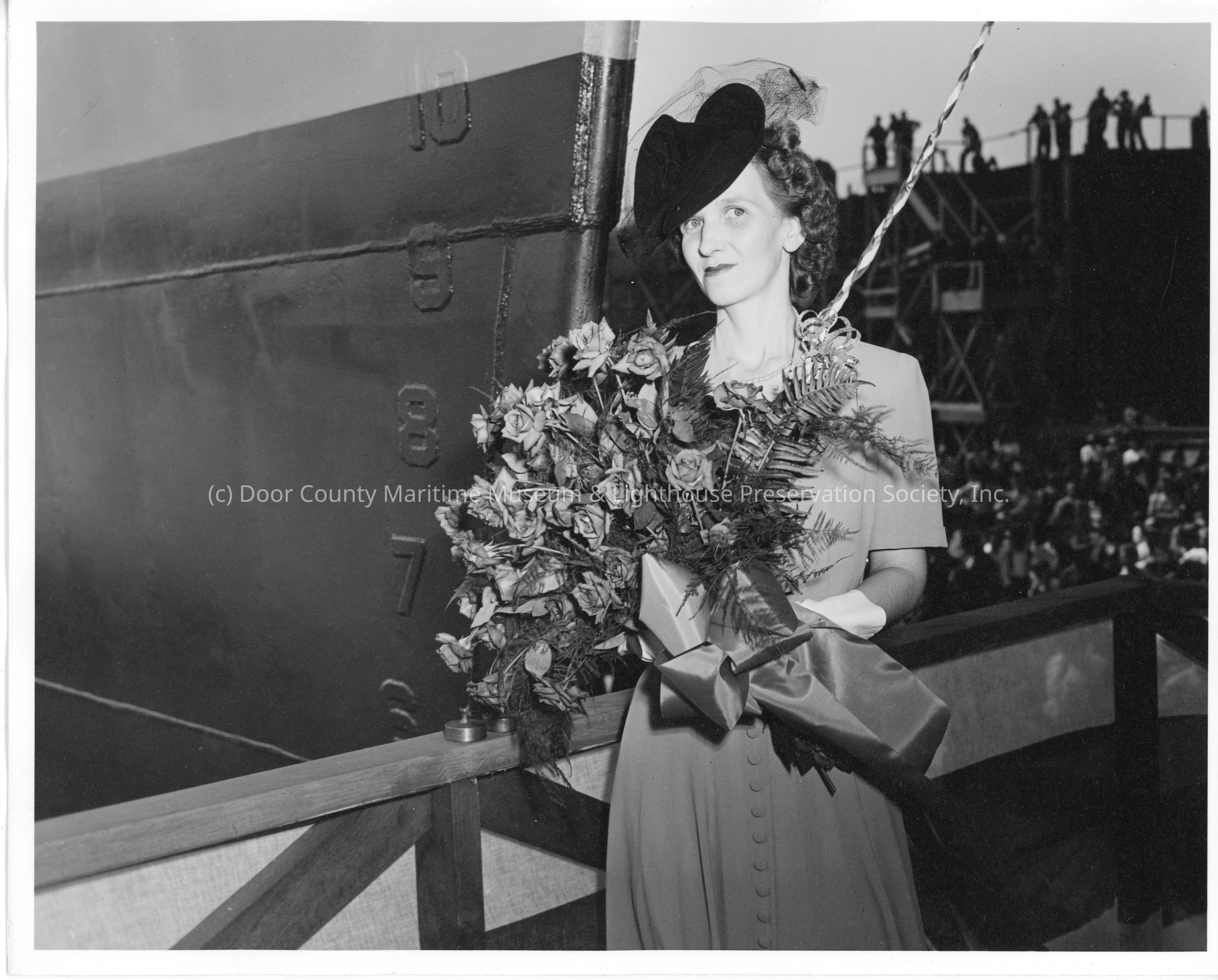 Mrs. Gus Johnson holding roses at christening of PF-64 USS KnoxvilleEntry/Object ID