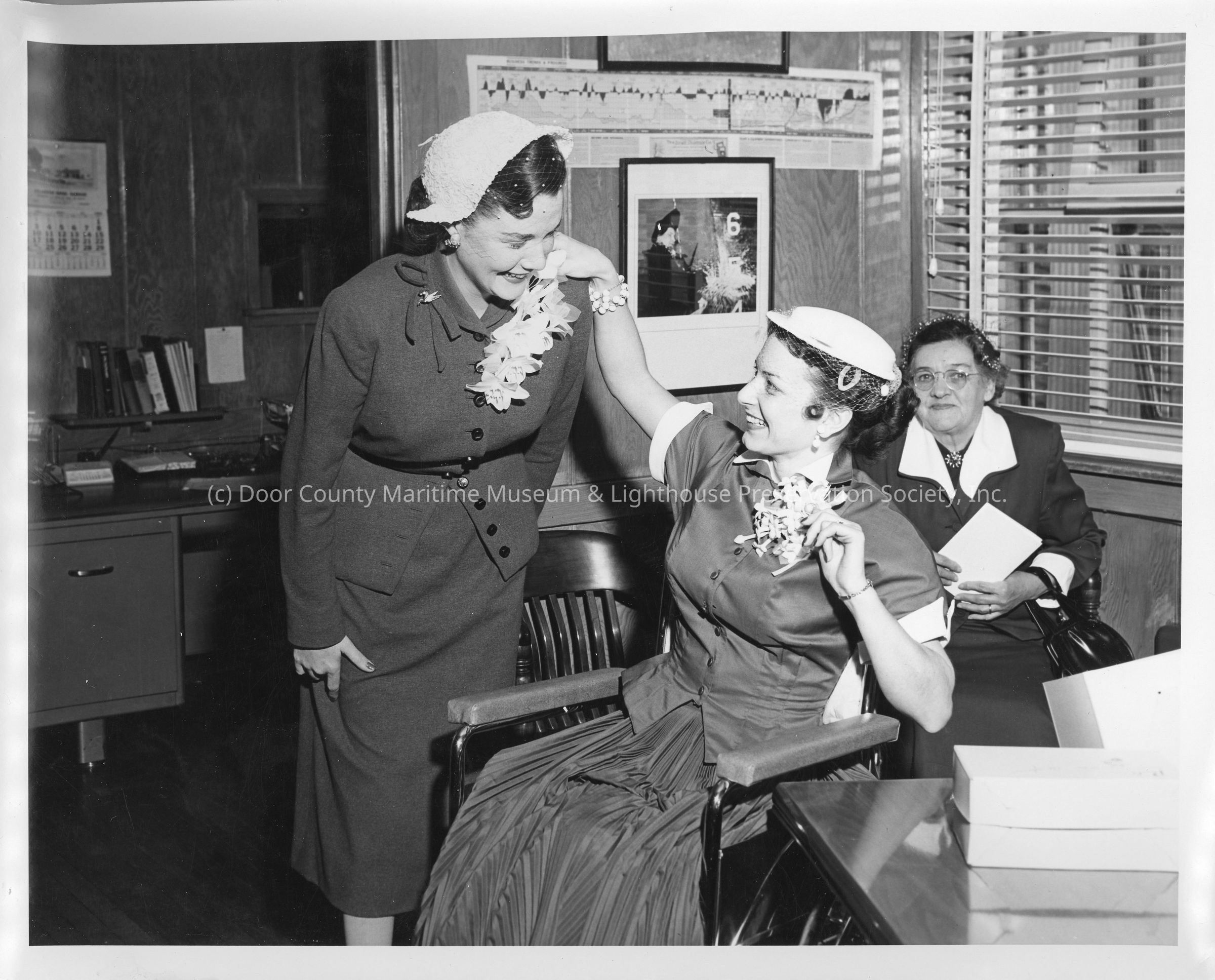 Mrs. Jean McCarthy and two women in Christy Corp office during Christening of LST-1170 May 22, 1954Entry/Object ID