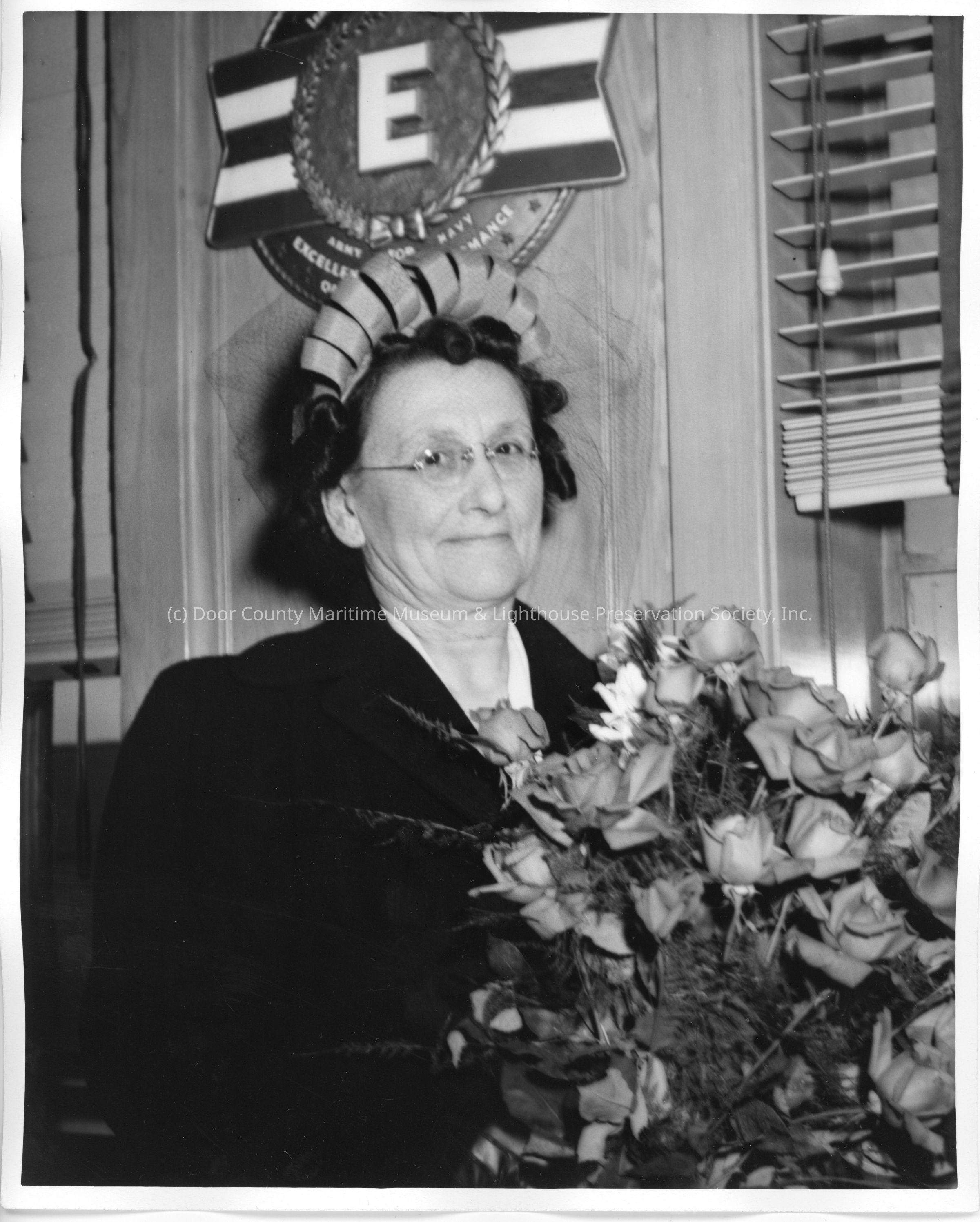 Mrs. Jos. O'Boyle holding roses in front of E plaqueEntry/Object ID