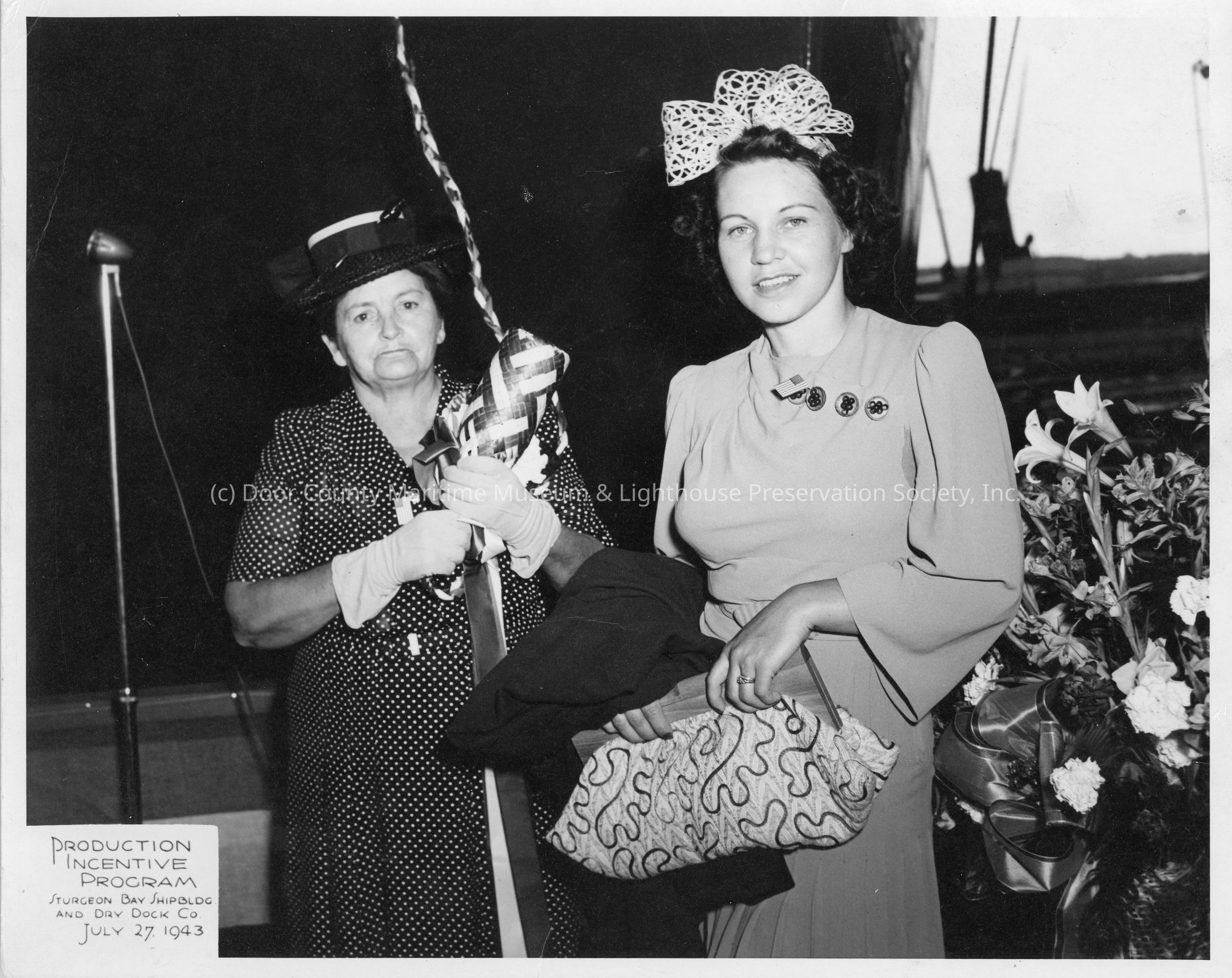 Mrs. Joseph Lortiz and Mrs. Russell Hanson at launching of F-13 July 27, 1943Entry/Object ID