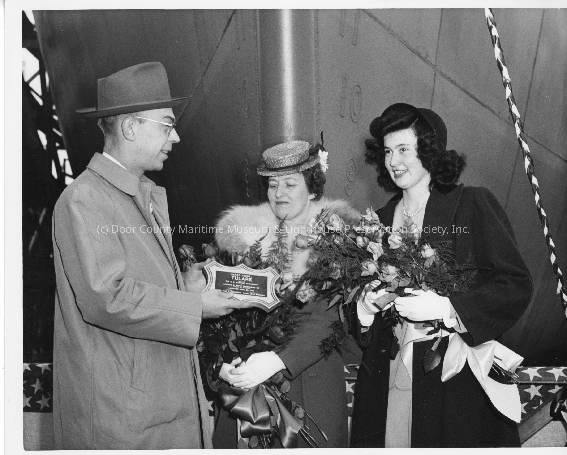 Mrs. Paul H. townsend receiving plaque for cargo vessel AK-217 TulareEntry/Object ID