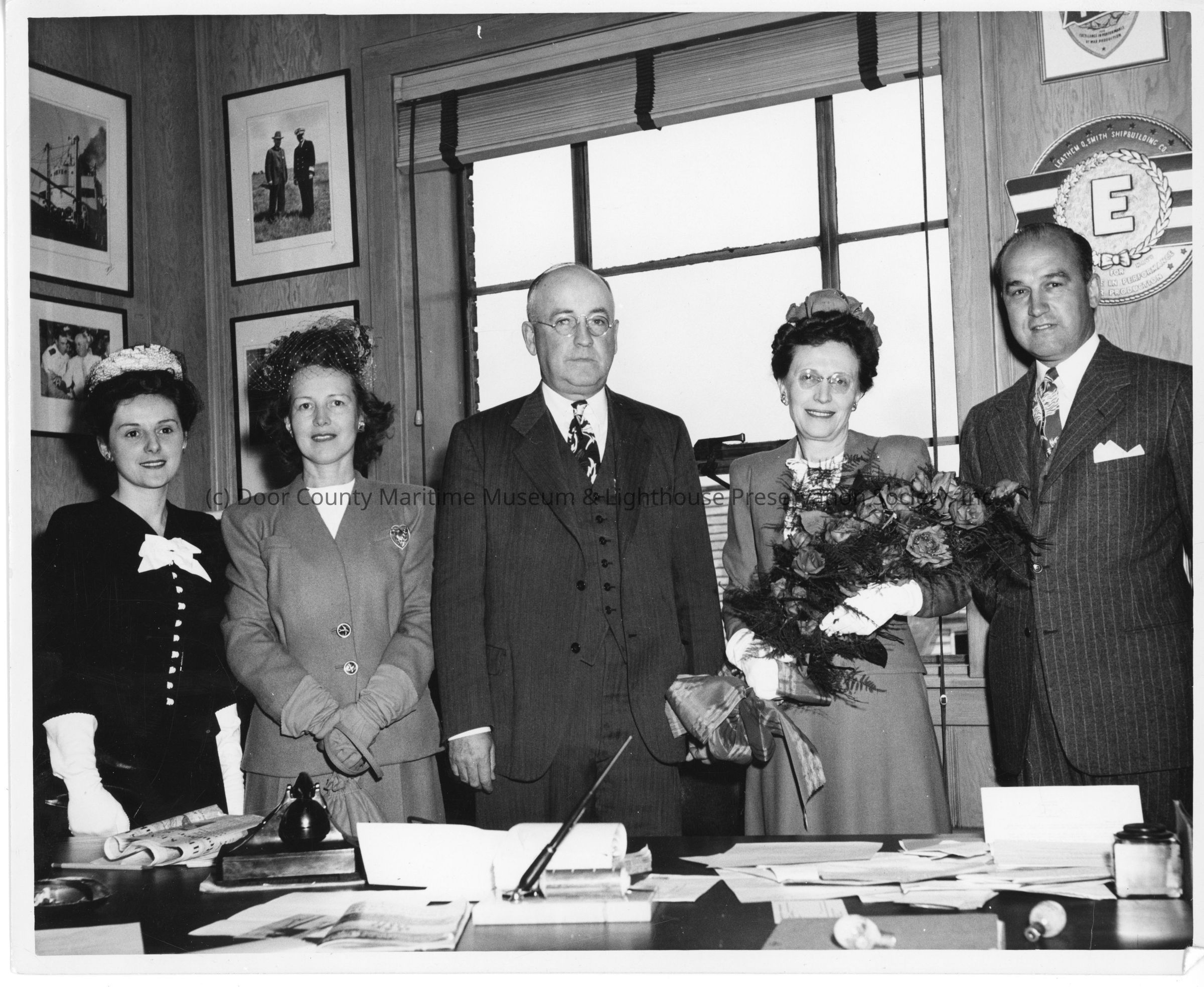 Mrs. Robert Rote, Jr. Alva Smith, and Leathem D. Smith in office at christening of AK-205 USS PoinsettEntry/Object ID