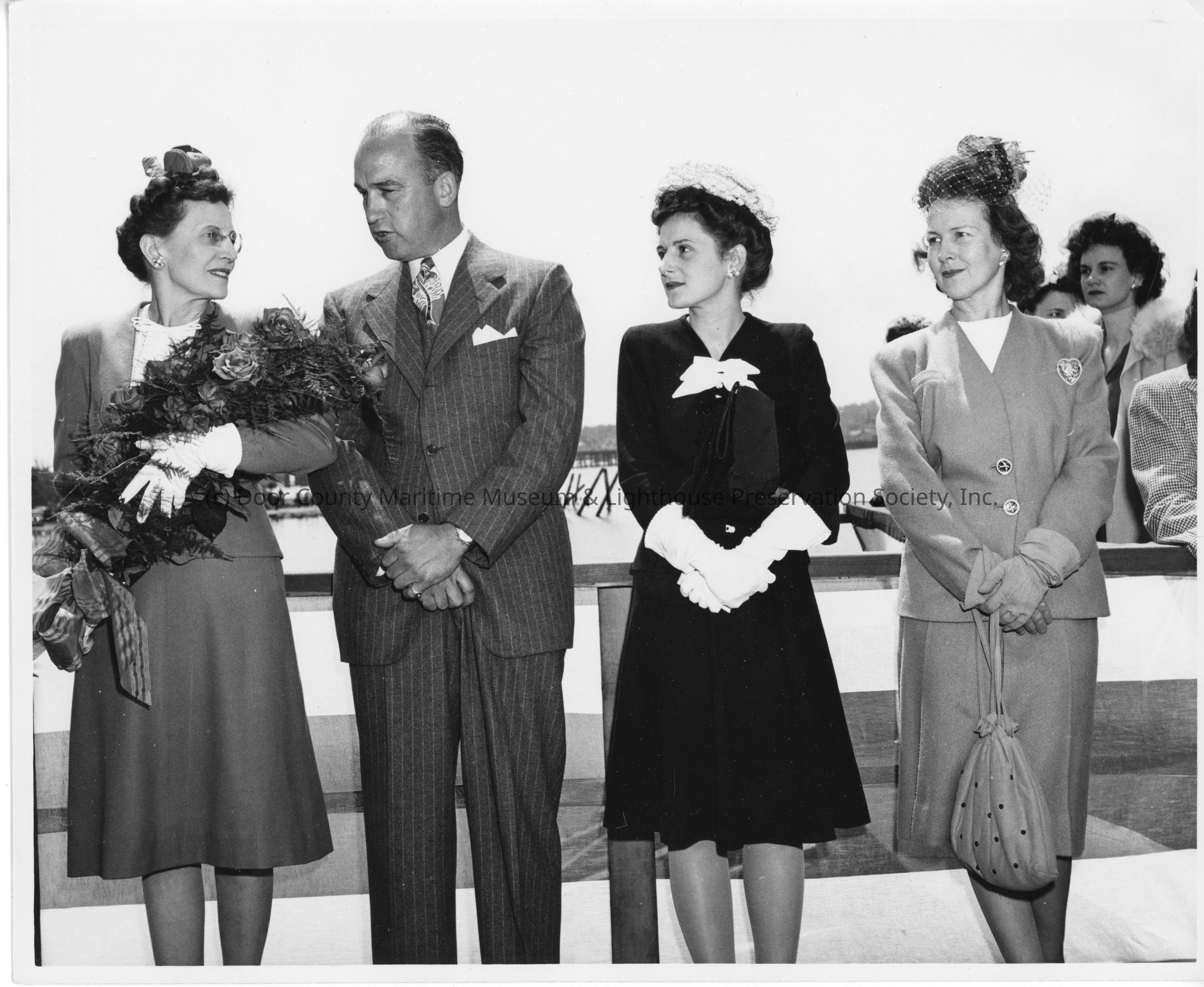 Mrs. Robert Rote Sr., Kary Reynolds, Mrs. Robert Rote Jr., and Alva Smith at christening of AK-205 USS PoinsettEntry/Object ID