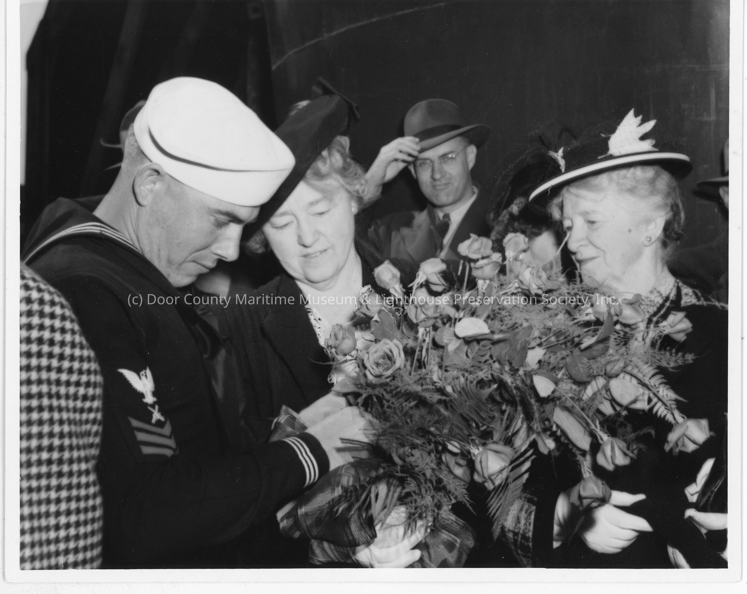 Mrs. William E. Wagener holding roses next to sailor at PC-1177 christeningEntry/Object ID