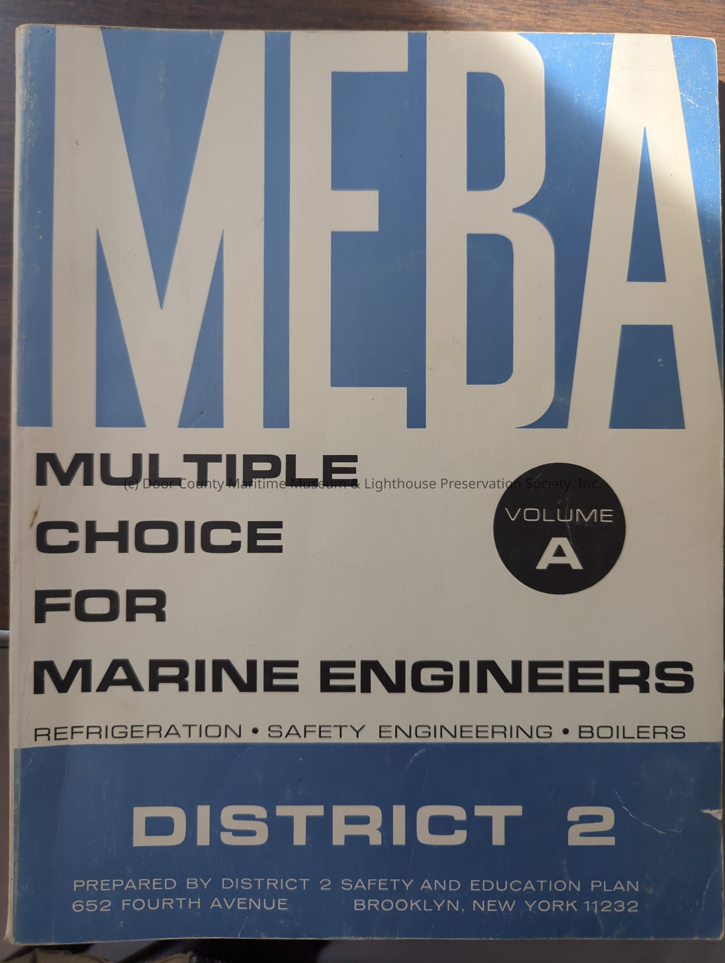 Light blue, white, and black colored course book. "Multiple Choice for marine Engineers Volume A"Location