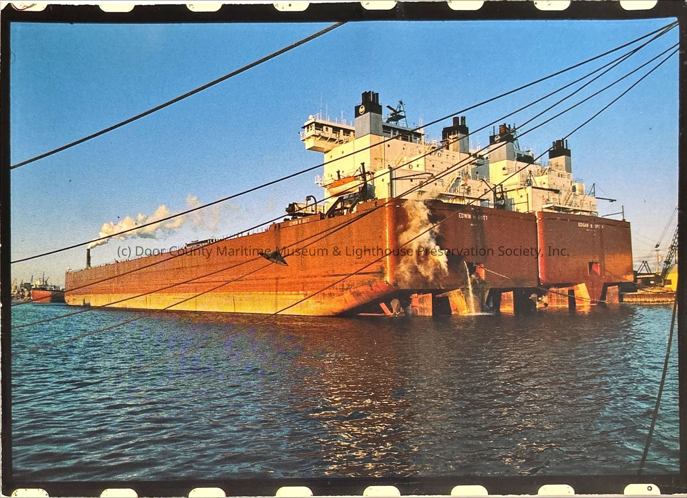 Stern end of both the Edwin H Gott and the Edgar B Speer while at dock. Gott has steam coming out of its smokestack at the bow and some coming from the stern end. The sky is clear blue, and they both have chains coming from their stern and heading right, out of frame.