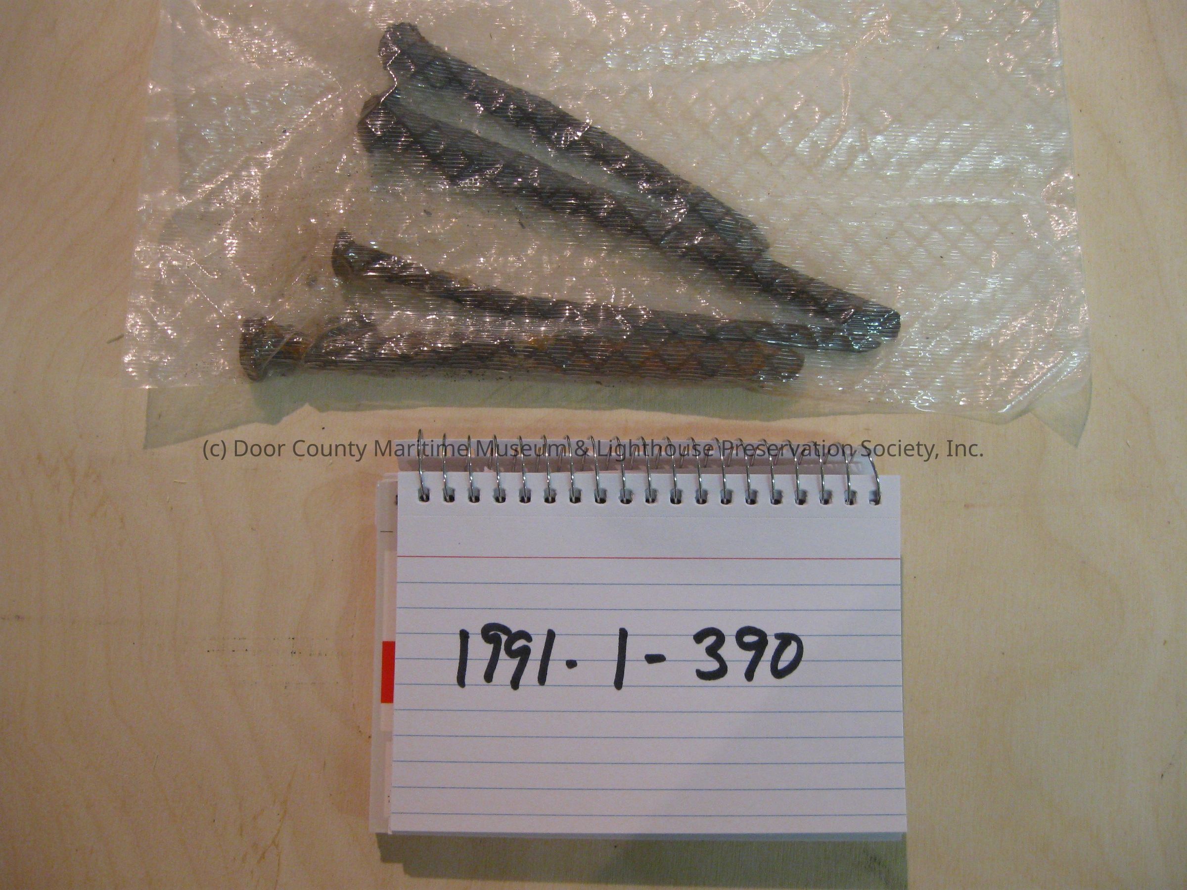 Four used square nails with rust and material attached.