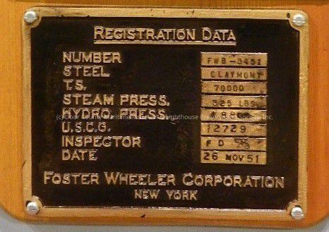 Registration data; #FWB-3451; USCG 12729; Steel Claymont; T.S. 70000; St. Press 325 lbs.; Hydro Press 488; Inspector F.D.; Date 26 Nov. 51Location