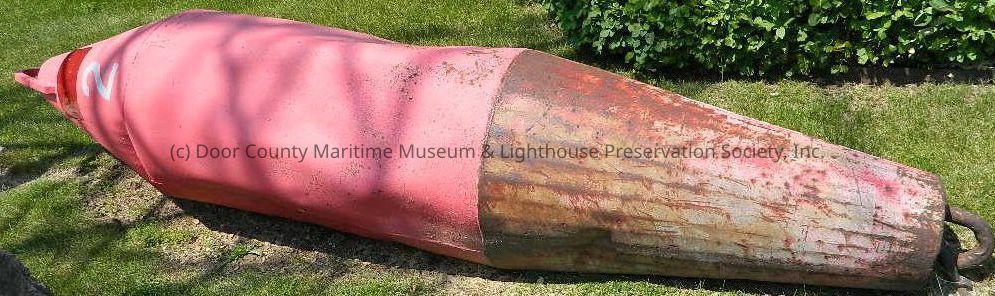Navigational buoy, 5th class (nun); overall color/red; three reflective red prism material pieces attached to top; bottom third of buoy pitted and faded from being in water; rusted eye bolt attached; center portion of buoy is dented and shape distorted; repainted by USCG.Location