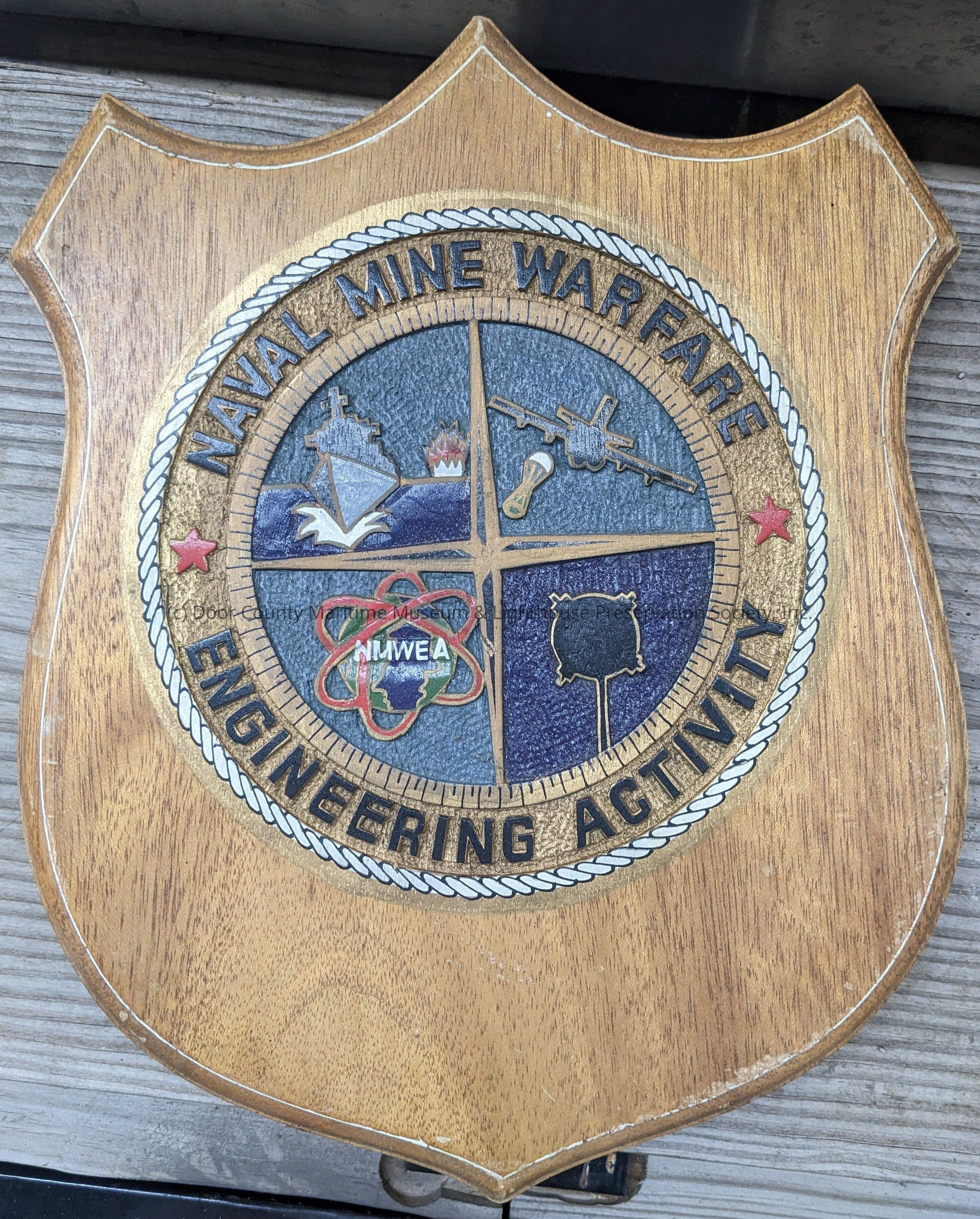 Wooden plaque in the shape of a shield depicting a plane, vessel, globe, and sea mine