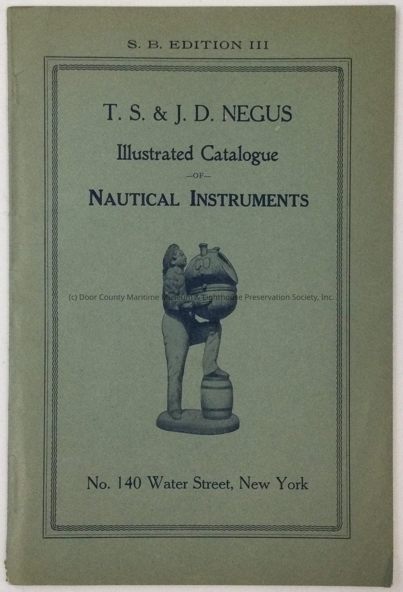 T.S.& J.D. Negus Illustrated Catalogue of Nautical Instruments Third Edition. Green Booklet with black text. Statue of man holding binnacle on front coverLocation