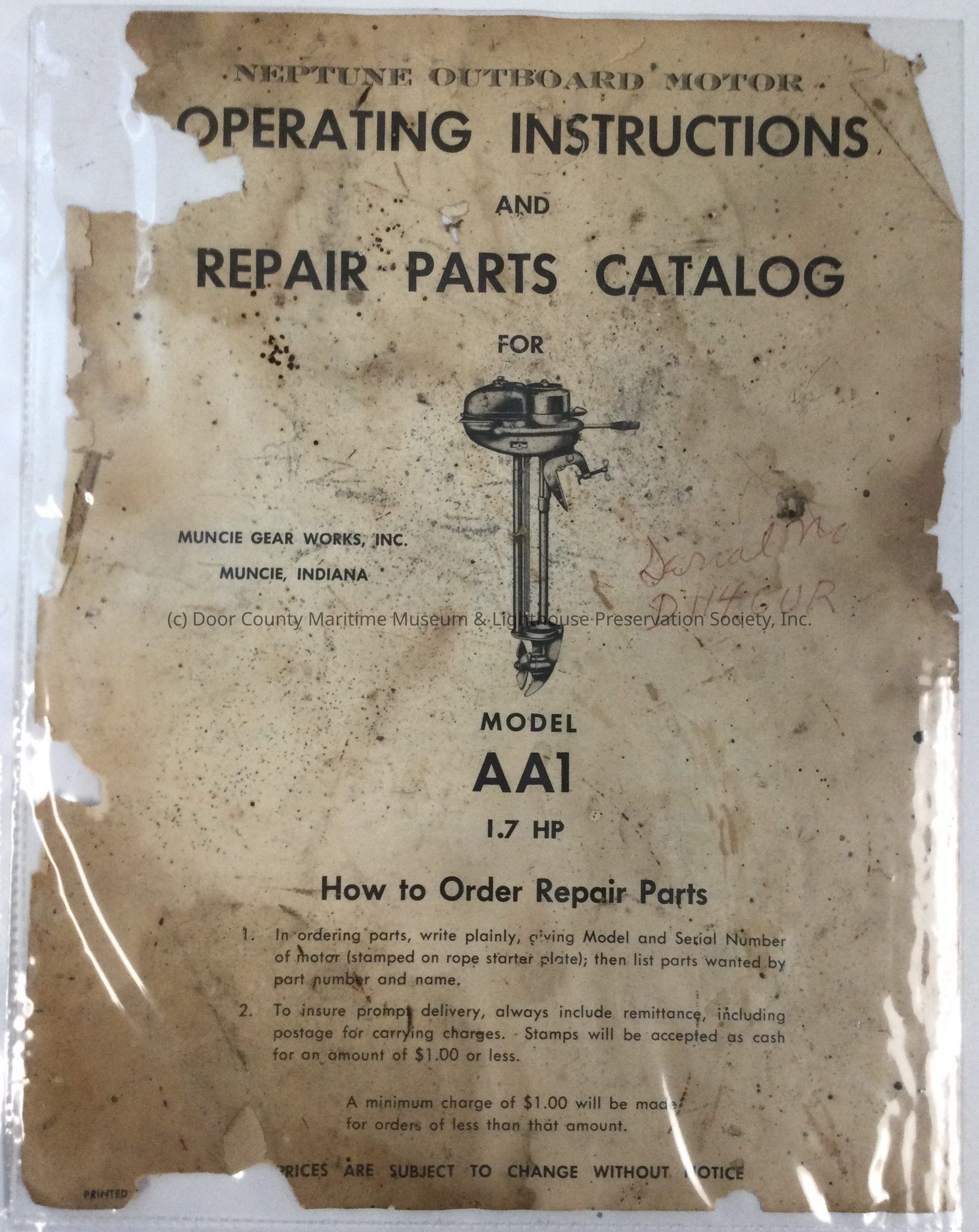 Operating instructions and repair catalog list for Neptune Outboard motor model AA1Location