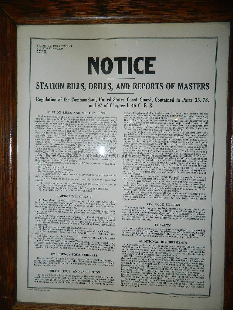 Notice-station bills, drills, and reports of masters; white paper, black print; CG-809; varnished brown frame, rough texture;Location