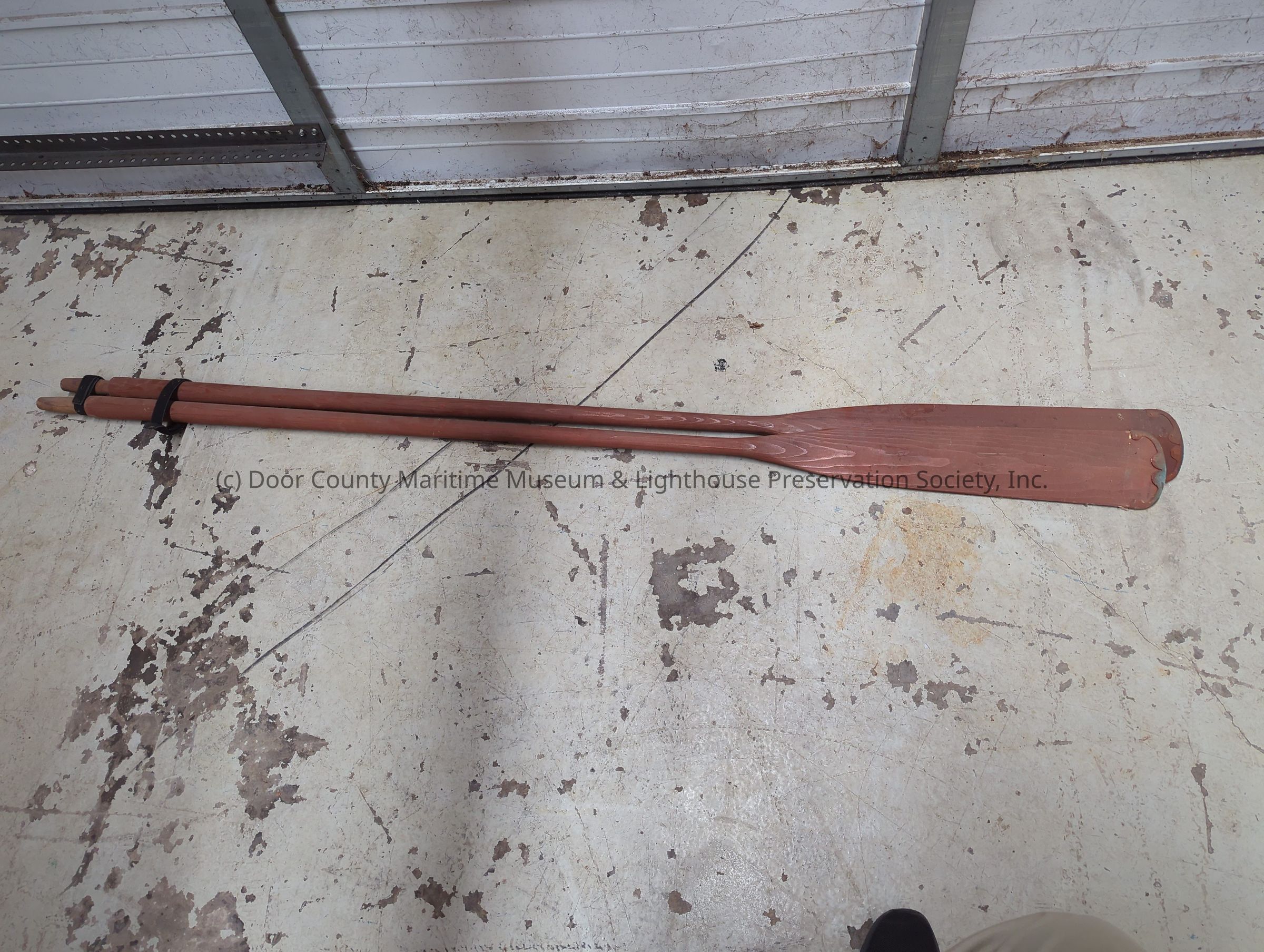 Two Cedar wood oars with brass caps at the end of the paddle surface.
