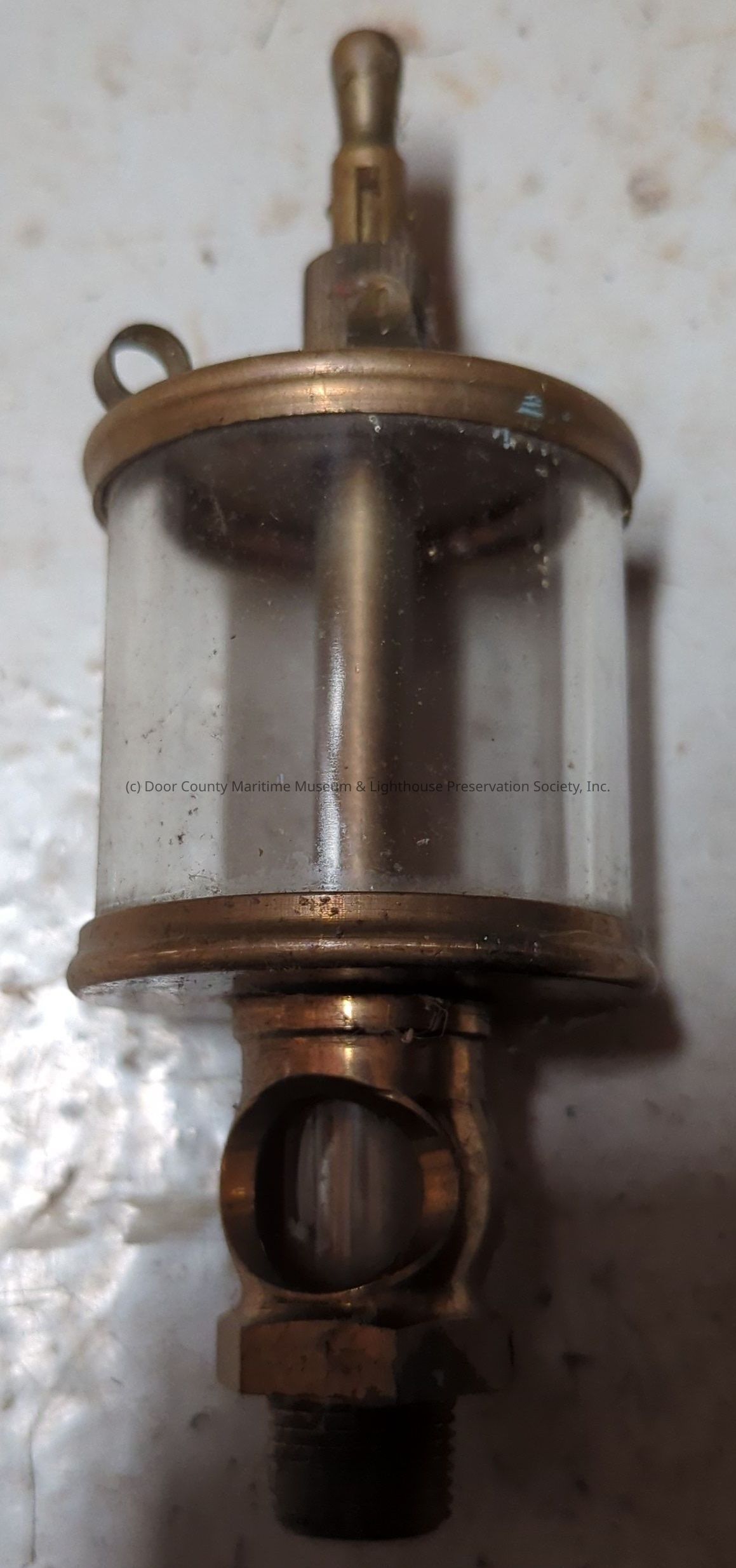 Metal and glass. Copper color. Engraved on top. Bottom section has glass. Oval window and screw type bottom.