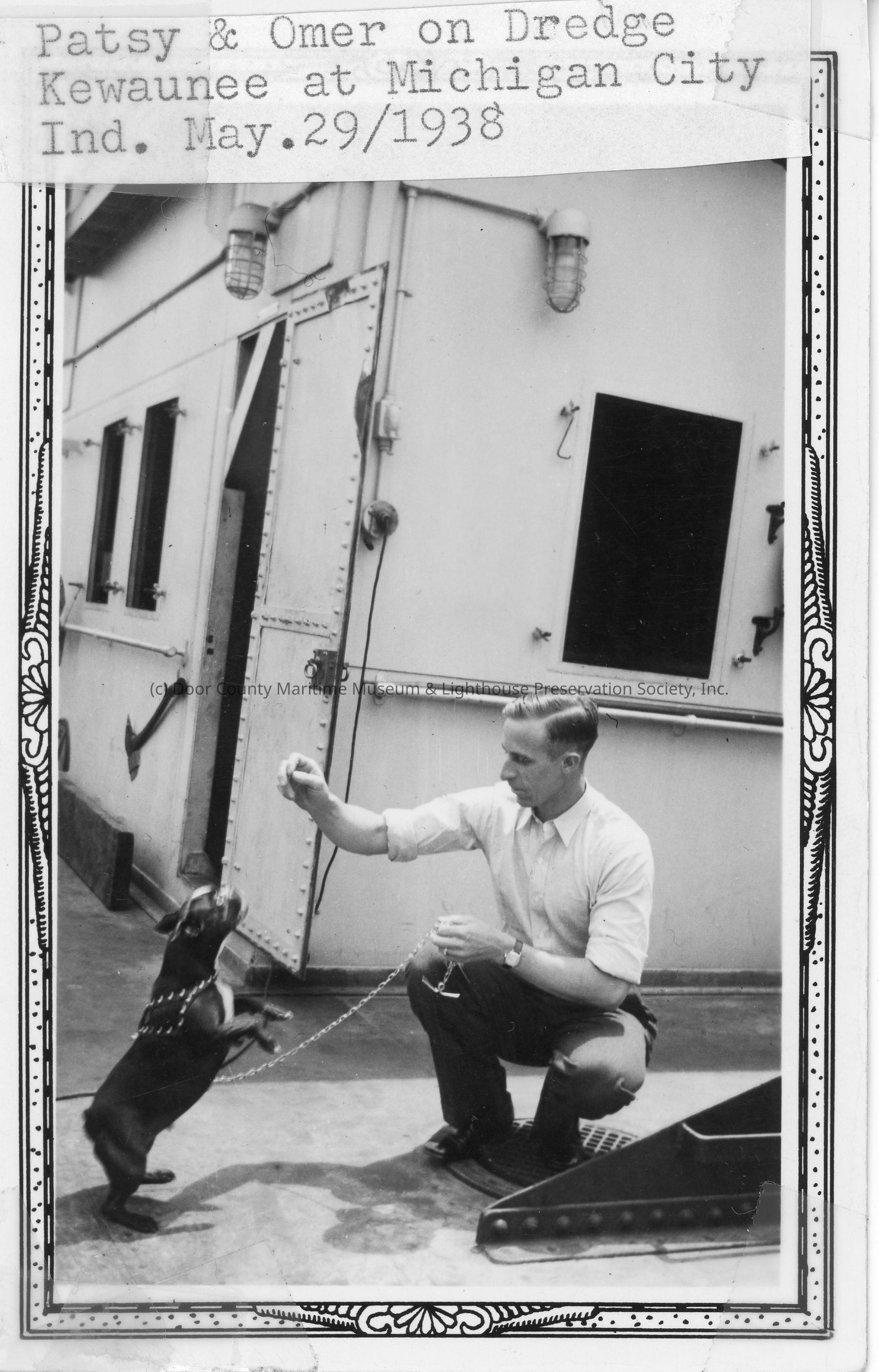 Omer and dog, Patsy, on dredge Kewaunee May 29, 1938