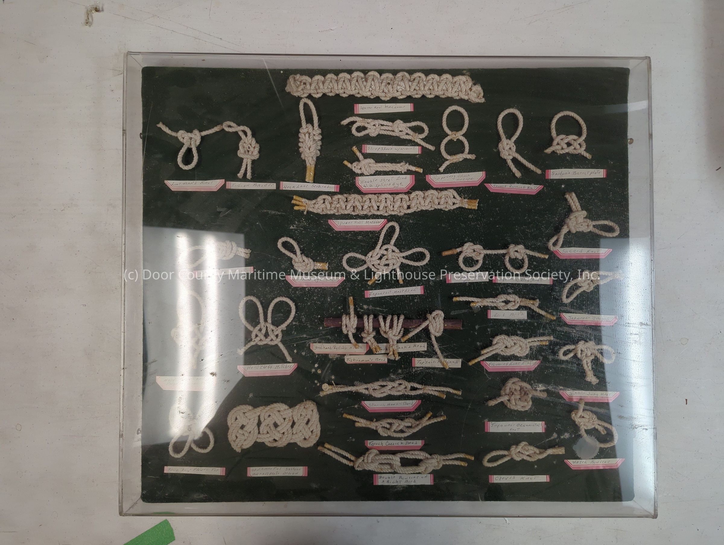 Knot display board: example of seaman's "folk art"; green velvet over wood; plastic cover; screws on sides for cover; one screw missing.Location