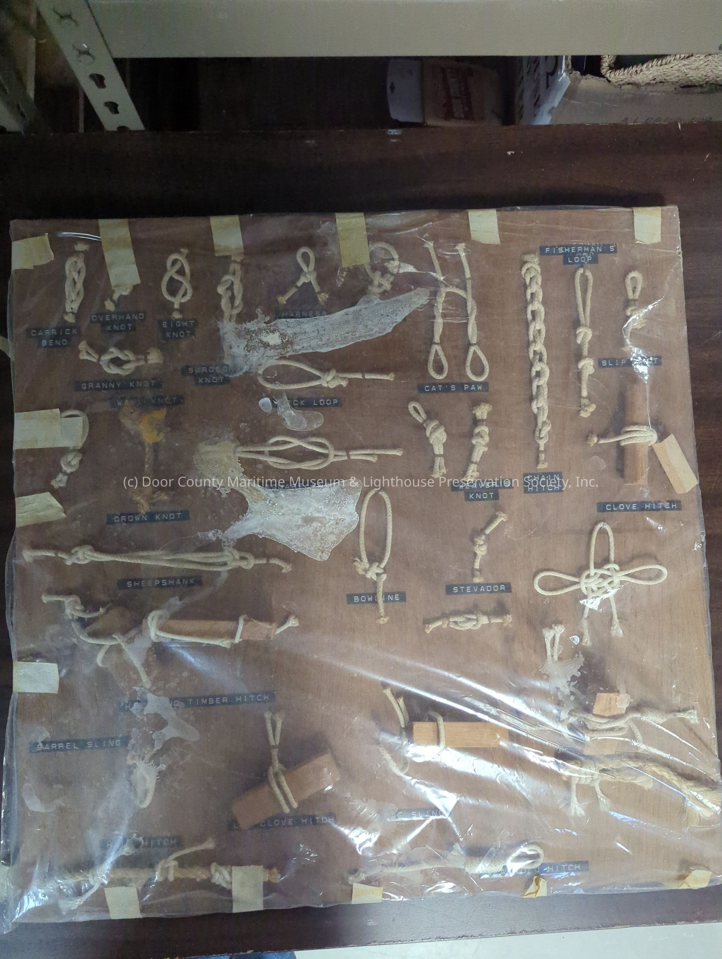 Knot board: varnished board with the following knots attached with staples--black plastic labels: carrick bend, overhand, eight, surgeons, harness, running bowline, cat's paw, fisherman's loop, granny, wall, neck loop, slip, crown, square, weavers, chain hitch, clove hitch, sheepshank, bowline, stevadore, barrel sling, half and timber hitch, half hitch, low clove hitch, bag sling, scaffold hitch,--seven of them have blocks of wood attached.Location
