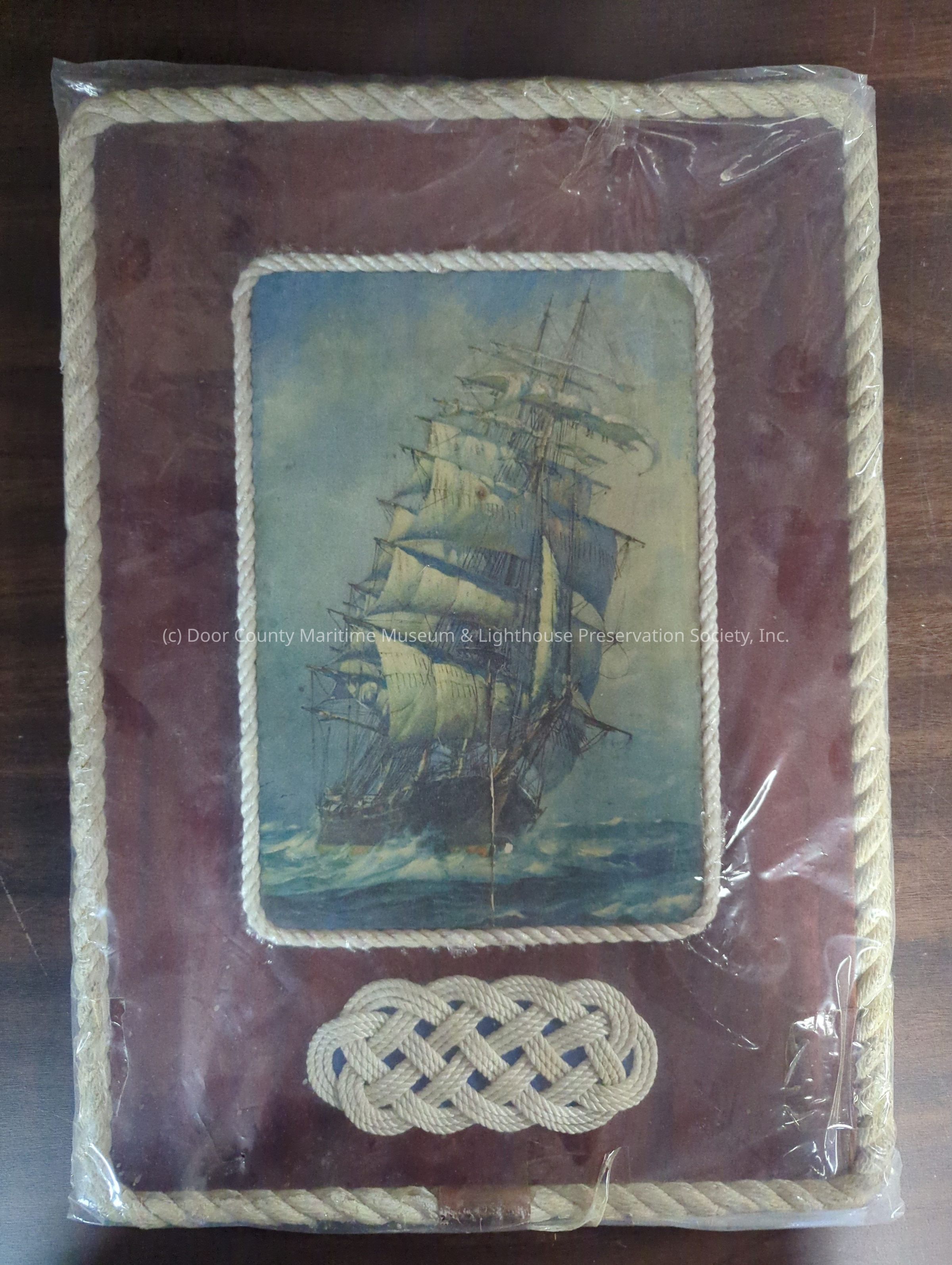 Knot board: display board varnished wood with rope trim; in center colored "painting" of sailing vessel with rope trim; beneath it a 5 5/8" x 3 1/2" white knot on blue back ground; copper colored