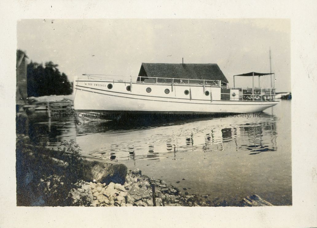The Oweenee, Hotz family vessel, near shore with mast stepped.